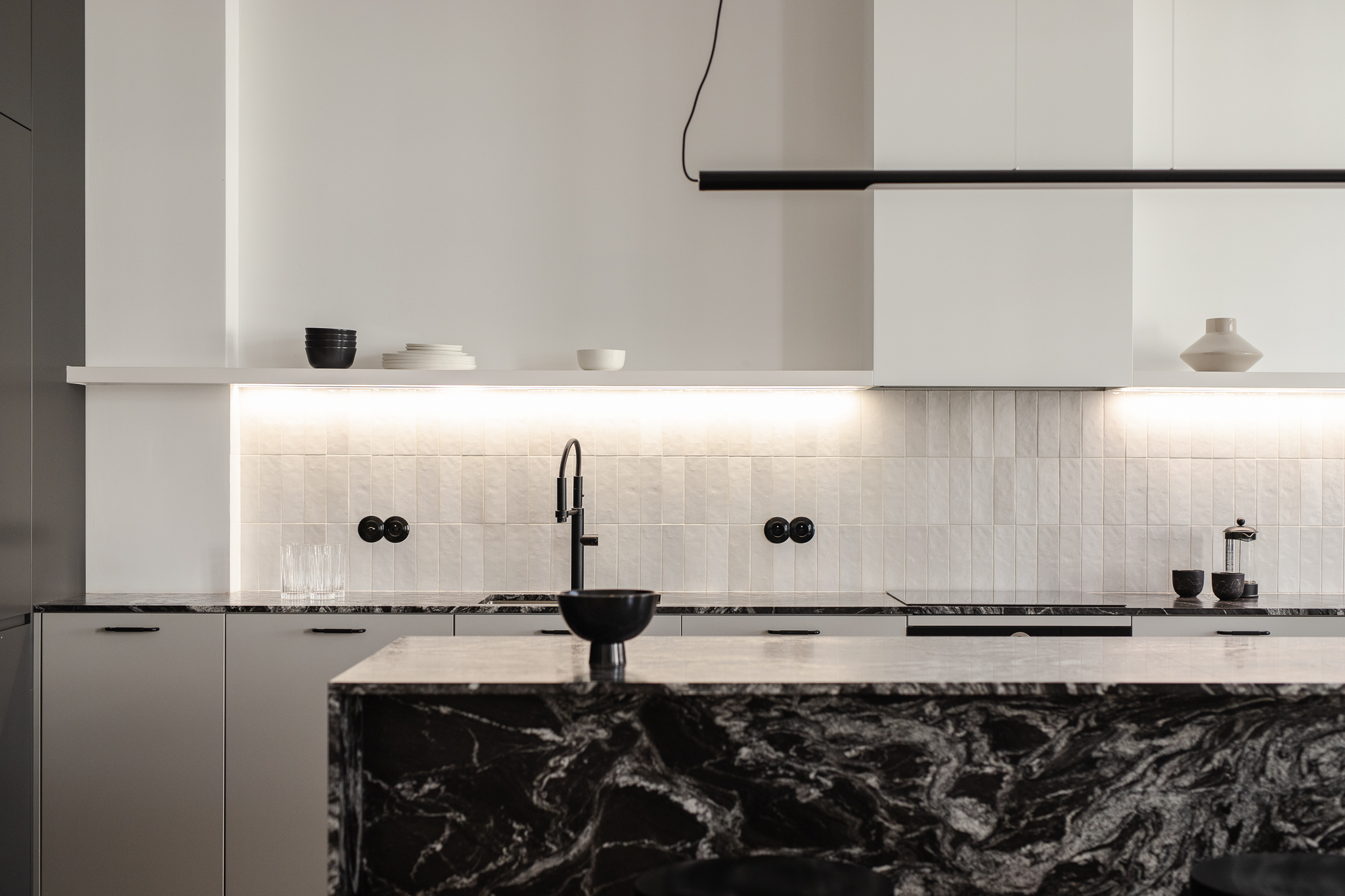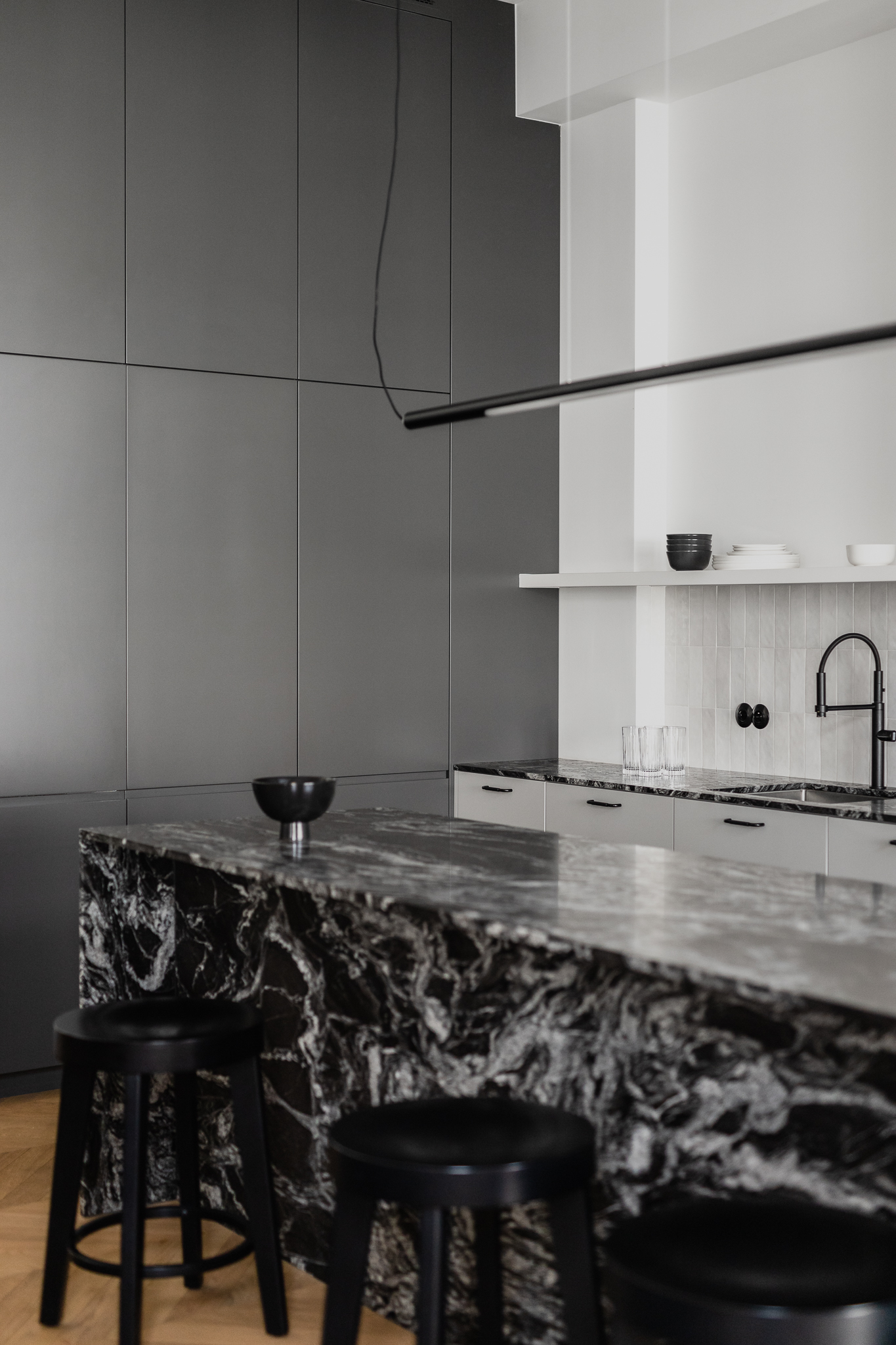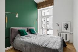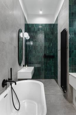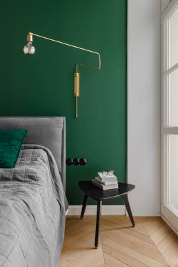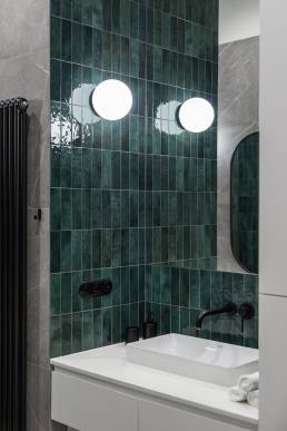 Sypialnia jest powściągliwa — minimum mebli, tapicerowane łóżko, złote lampy na wysięgnikach i ściana w kolorze butelkowej zieleni. Łazienki zdobi szary kamień z delikatną żyłą i ciemnozielone płytki nawiązujące do kuchni, uzupełnione czarnymi detalami i modernistycznymi kinkietami w kształcie kuli.