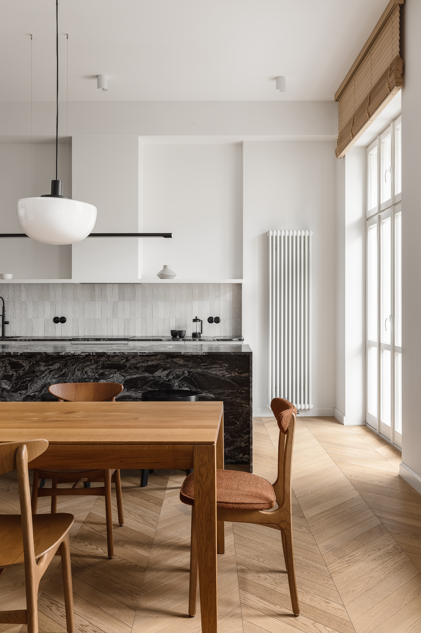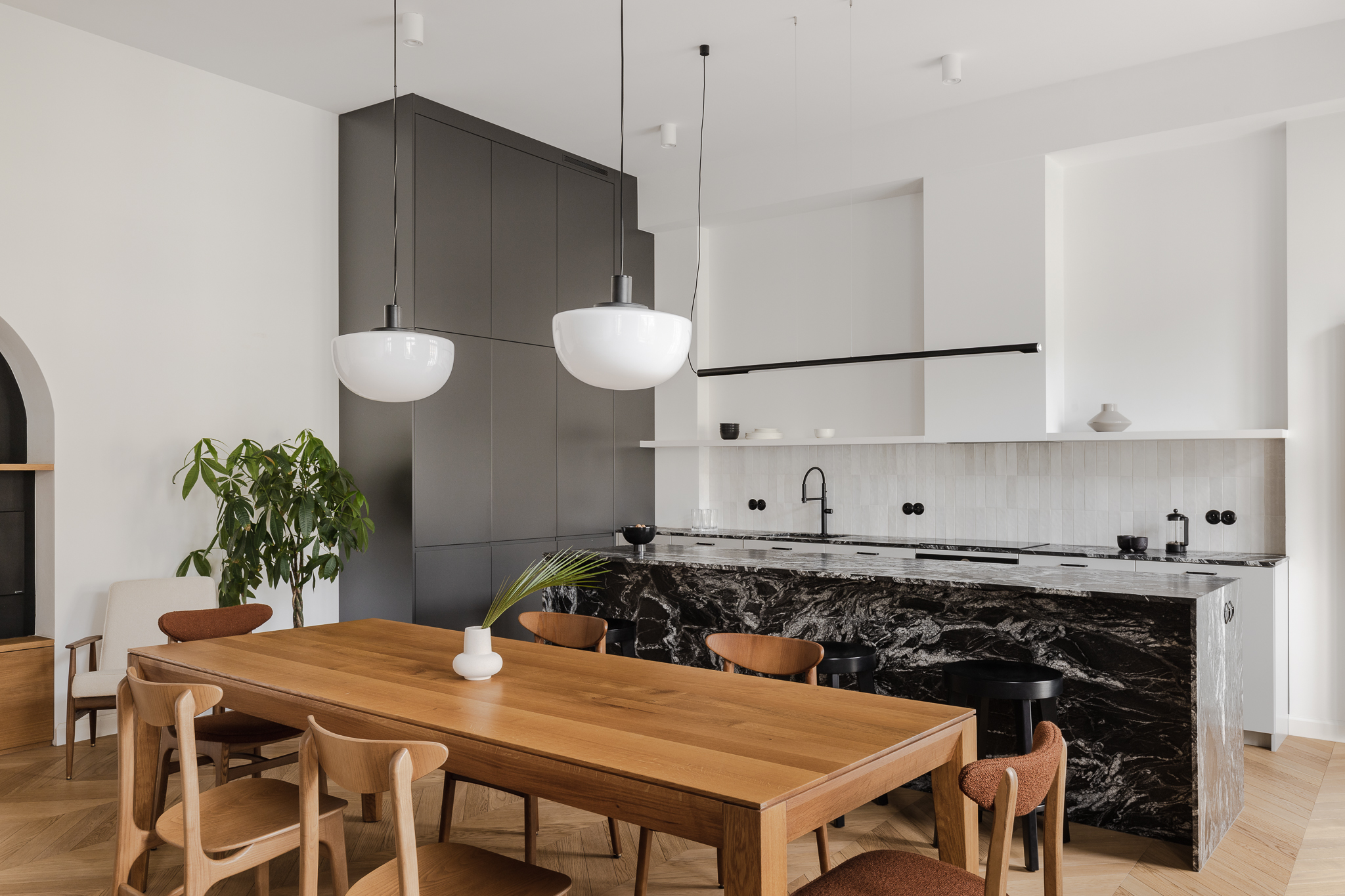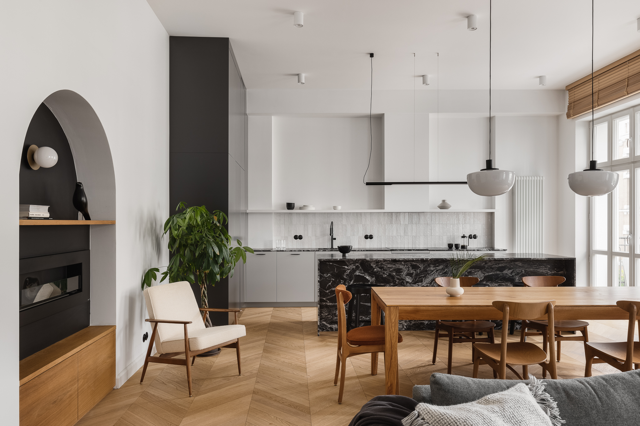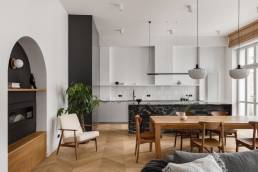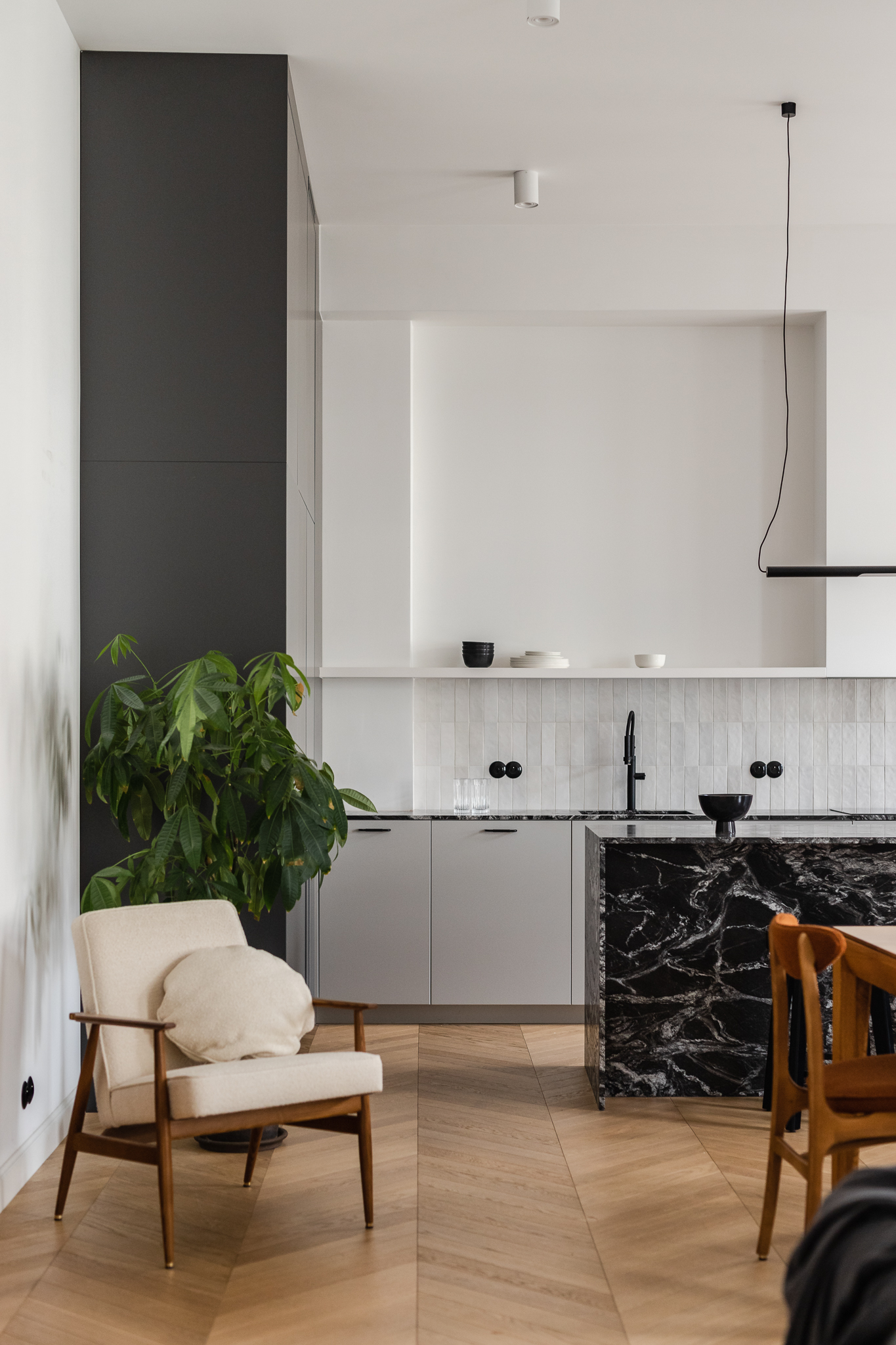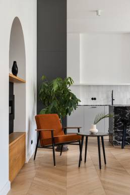 Centralny korytarz dzieli mieszkanie na dwie strefy — prywatną i dzienną. Część dzienna łączy trzy funkcje: salon z narożnikiem i ukrytym biurkiem, jadalnię z krzesłami 200-190 od 366 Concept i kuchnię z monolityczną wyspą z granitu o wyrazistym rysunku. Charakterystycznym elementem jest zachowana z oryginalnego wnętrza półokrągła wnęka, podkreślona ciemnym wykończeniem, obok której stoi kultowy fotel 366 Józefa Chierowskiego.