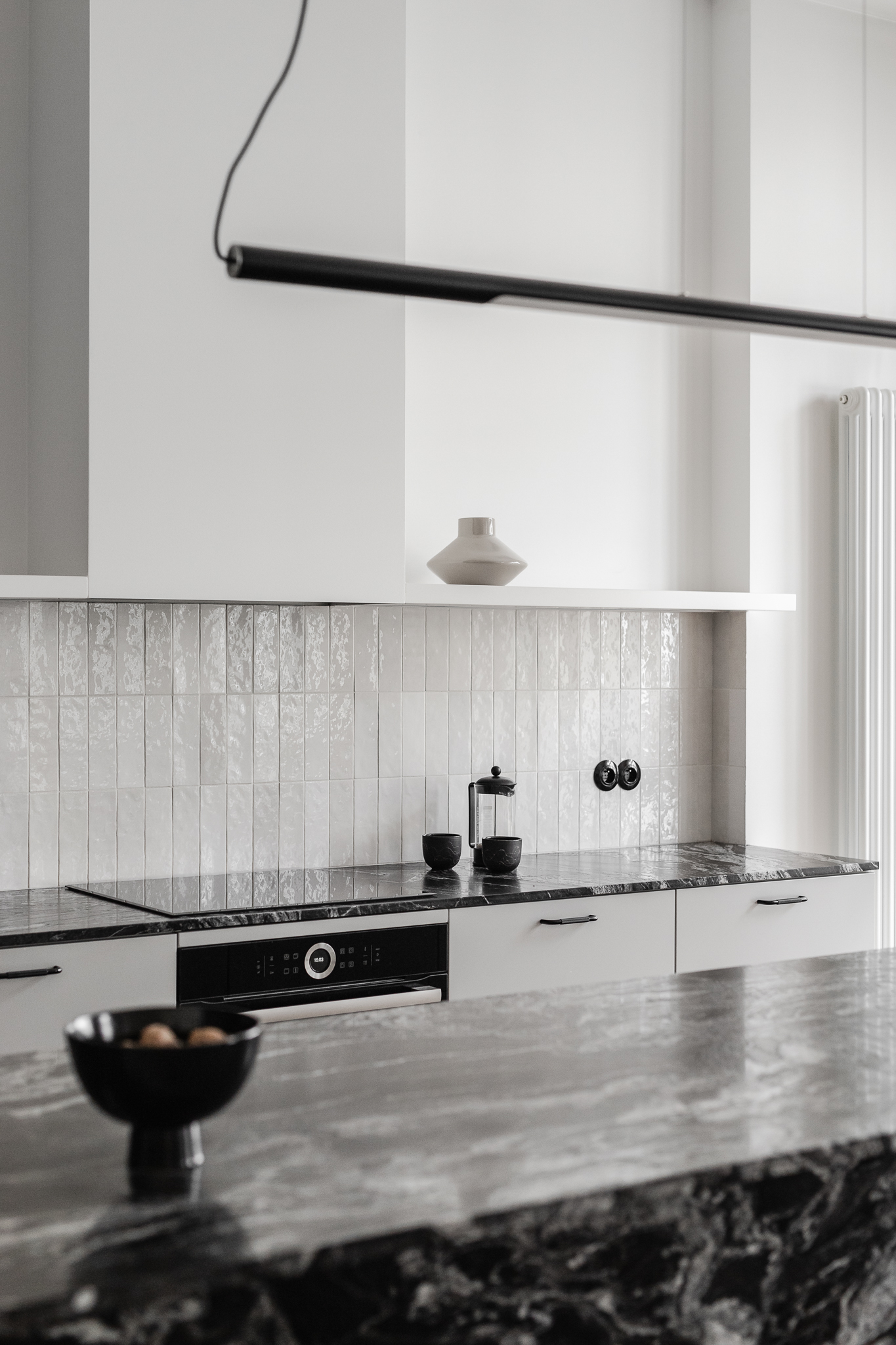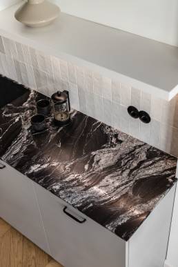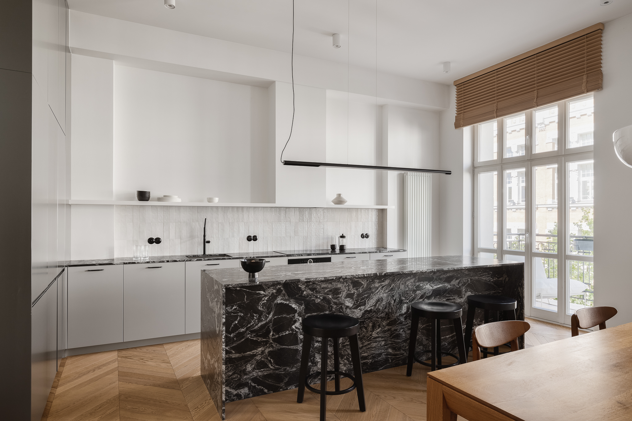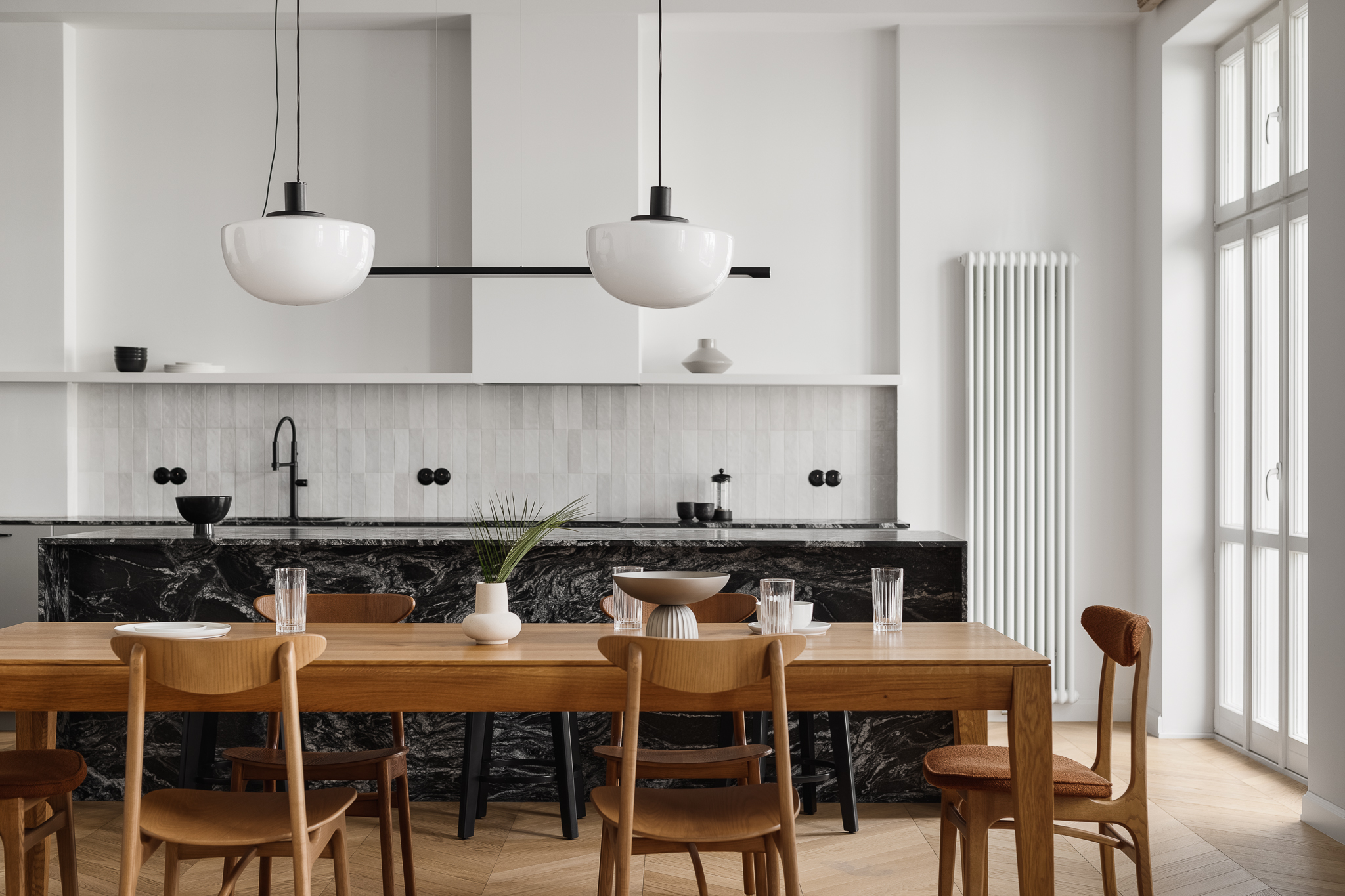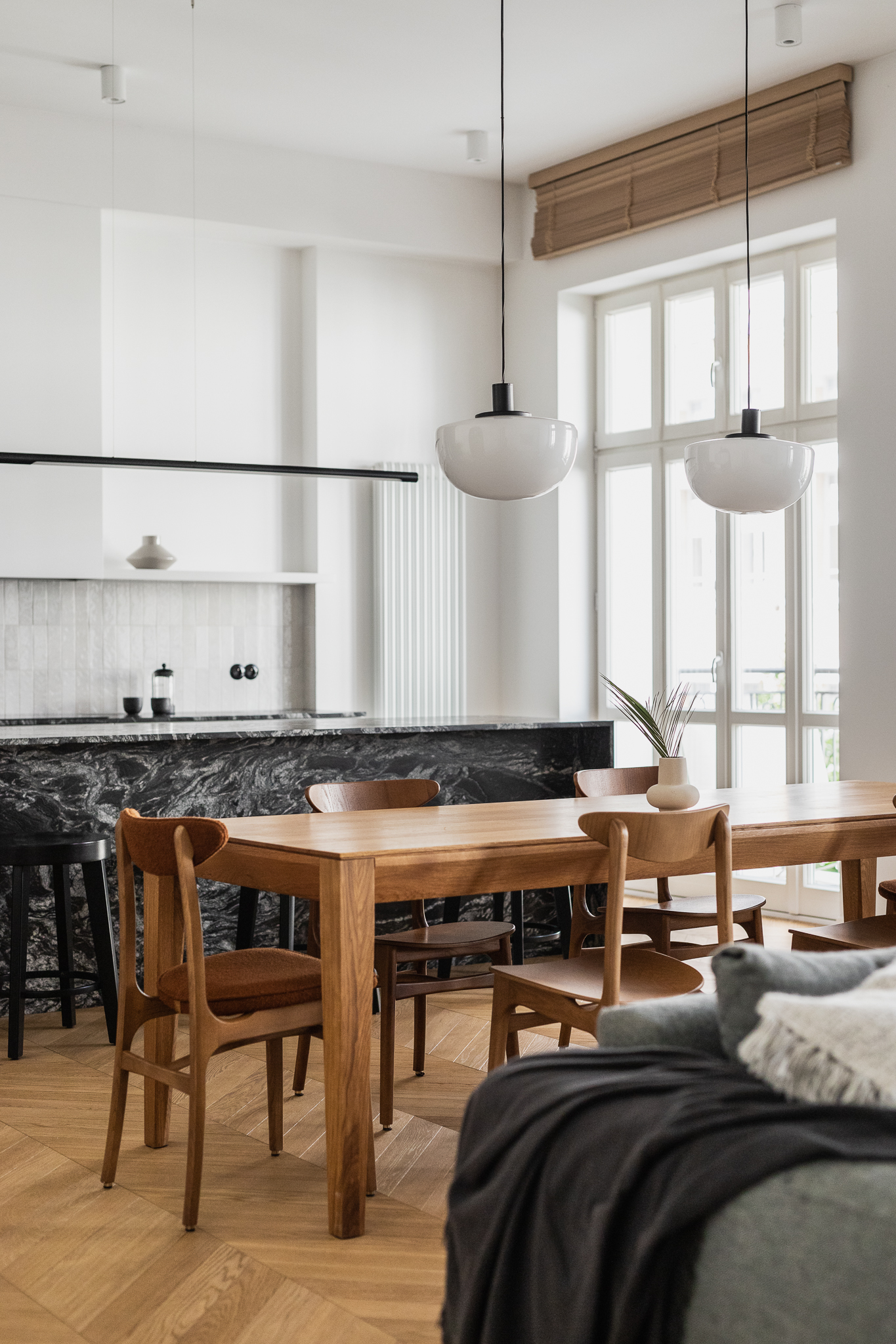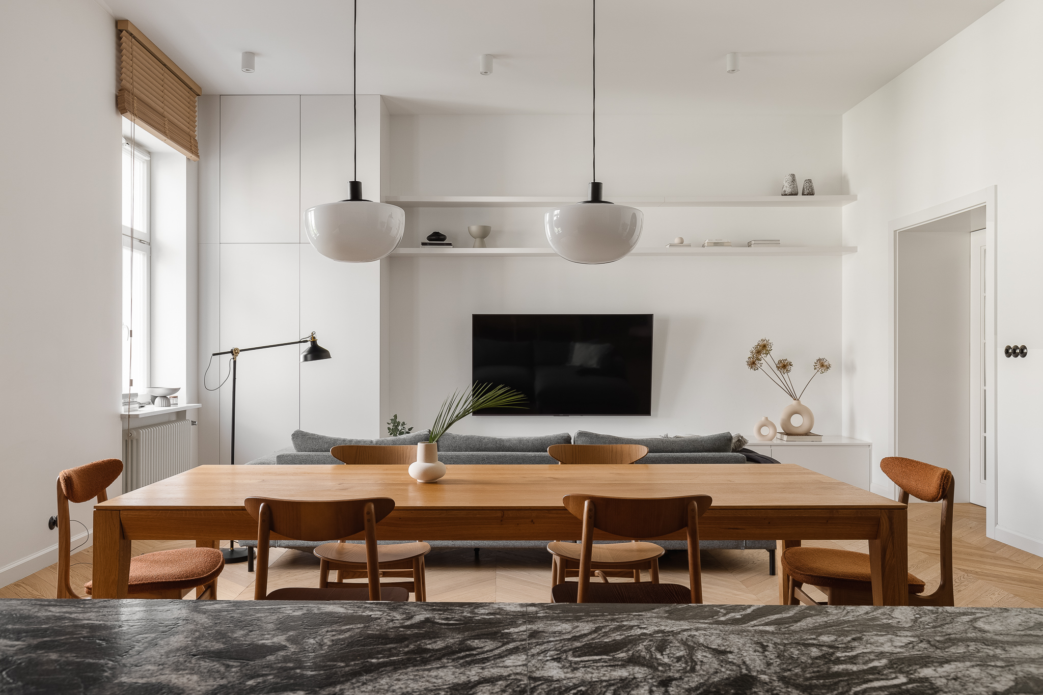 Centralny korytarz dzieli mieszkanie na dwie strefy — prywatną i dzienną. Część dzienna łączy trzy funkcje: salon z narożnikiem i ukrytym biurkiem, jadalnię z krzesłami 200-190 od 366 Concept i kuchnię z monolityczną wyspą z granitu o wyrazistym rysunku. Charakterystycznym elementem jest zachowana z oryginalnego wnętrza półokrągła wnęka, podkreślona ciemnym wykończeniem, obok której stoi kultowy fotel 366 Józefa Chierowskiego.