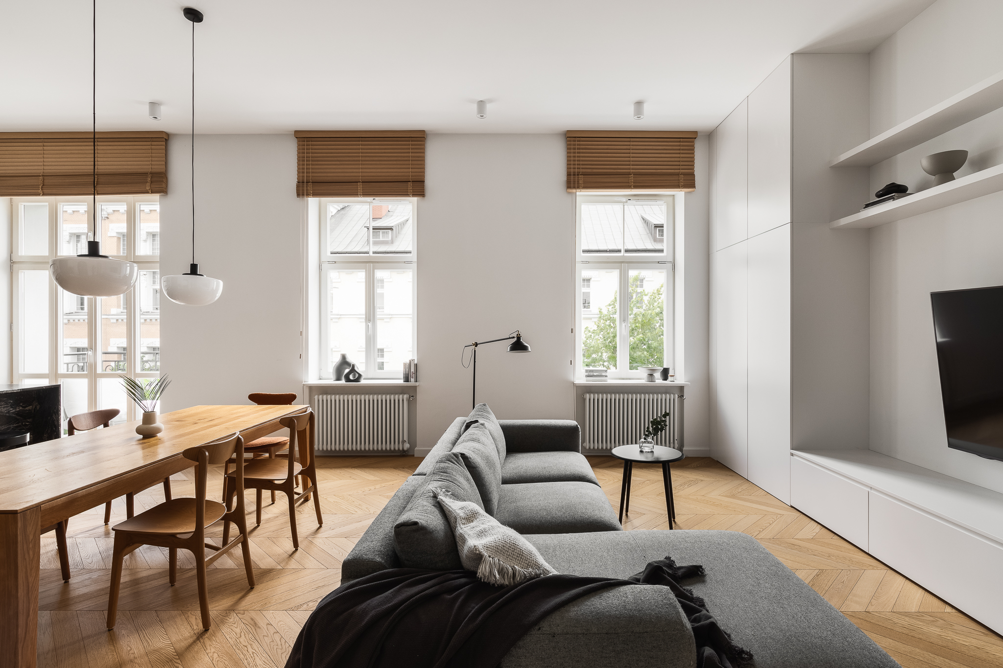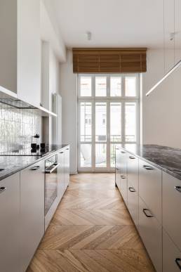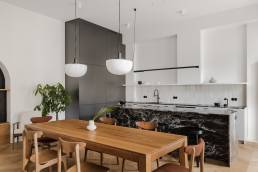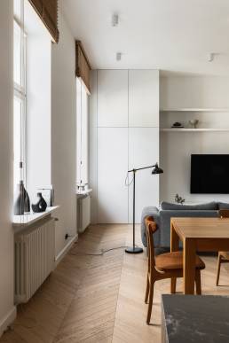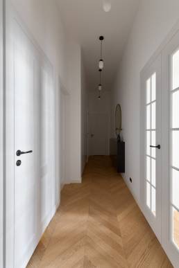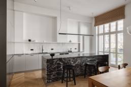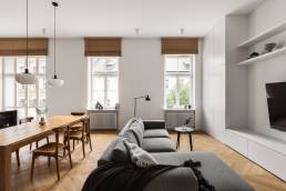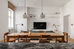 Realizacja Karoliny Potębskiej i Joanny Olech to 100-metrowe mieszkanie w kamienicy z 1914 roku na warszawskiej Pradze, w którym minimalizm spotyka się z historią miejsca. Sesja fotograficzna tej przestrzeni powstała w ramach współpracy z duetem architektek — jedną z realizacji w moim portfolio fotografii wnętrz.