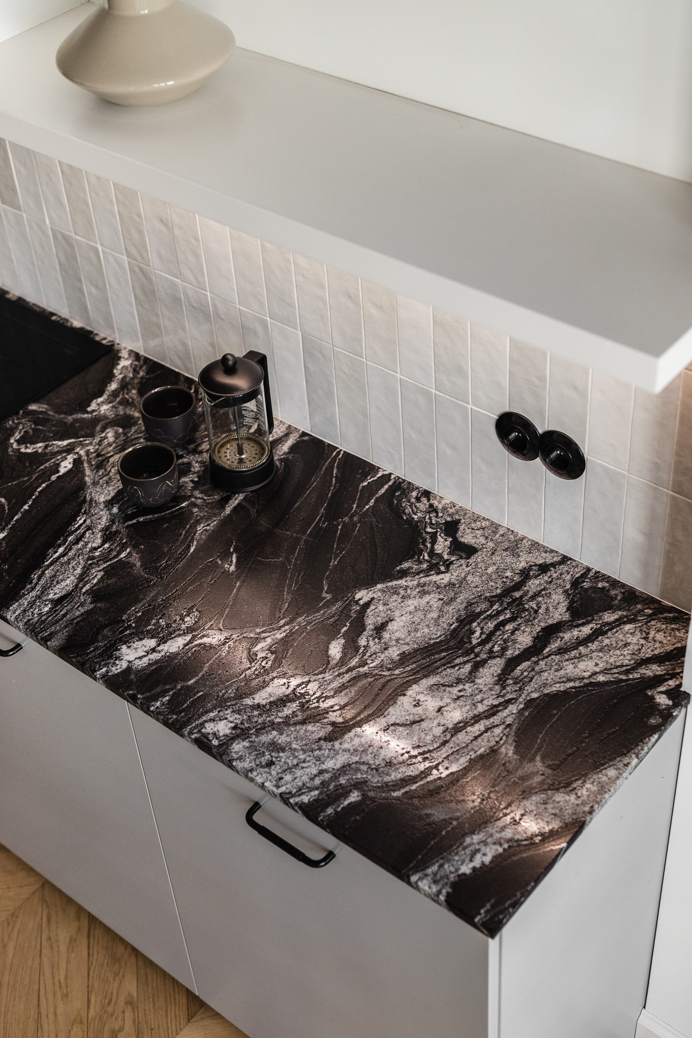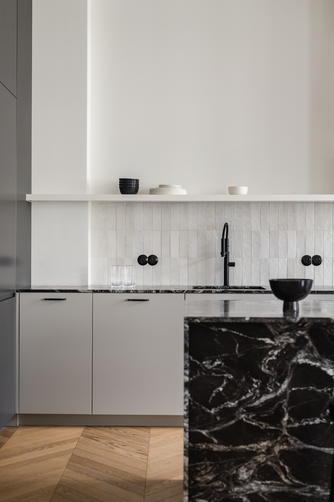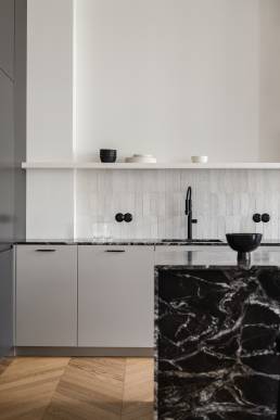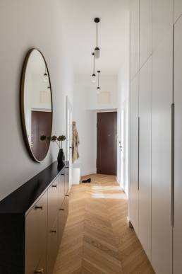 Inwestorzy szukali swojego pierwszego wspólnego mieszkania. Zależało im na cichych strefach odpoczynku, otwartych przestrzeniach do spotkań z bliskimi i miejscu sprzyjającym skupieniu. Projektantki odpowiedziały na te potrzeby kontrastem faktur oraz grą światła i cienia, ograniczając paletę do bieli, szarości, czerni i akcentów zieleni. Dębowa podłoga ułożona w jodełkę francuską wizualnie ociepla całą przestrzeń.
