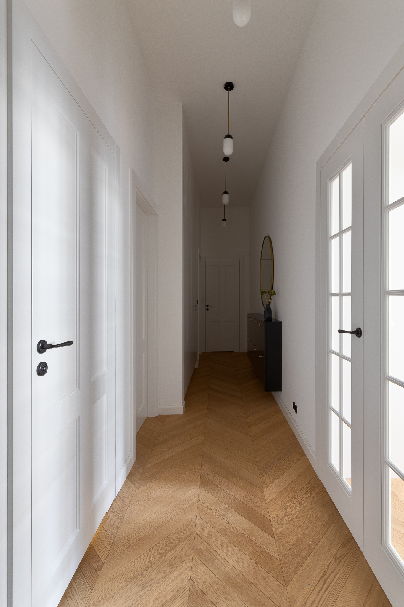 Szkło i mosiądz przewijają się przez całe wnętrze — od lamp belgijskiej marki Zangra w korytarzu po dwuskrzydłowe drzwi z przeszkleniami wykonane na zamówienie.