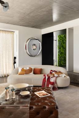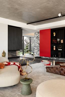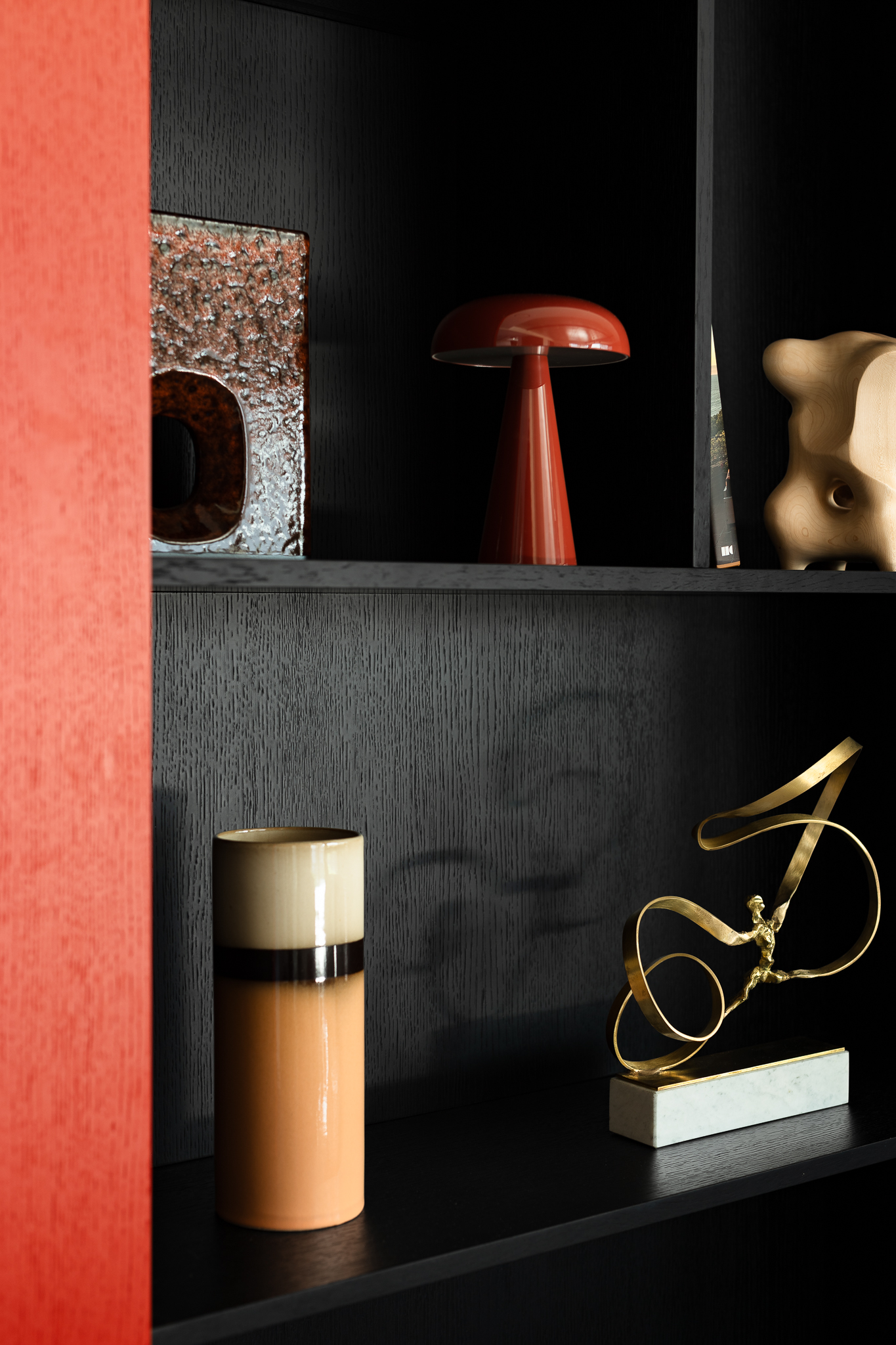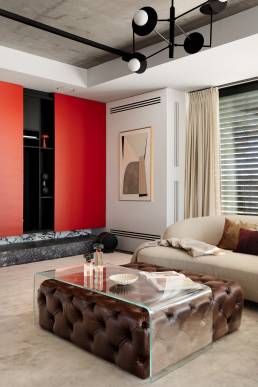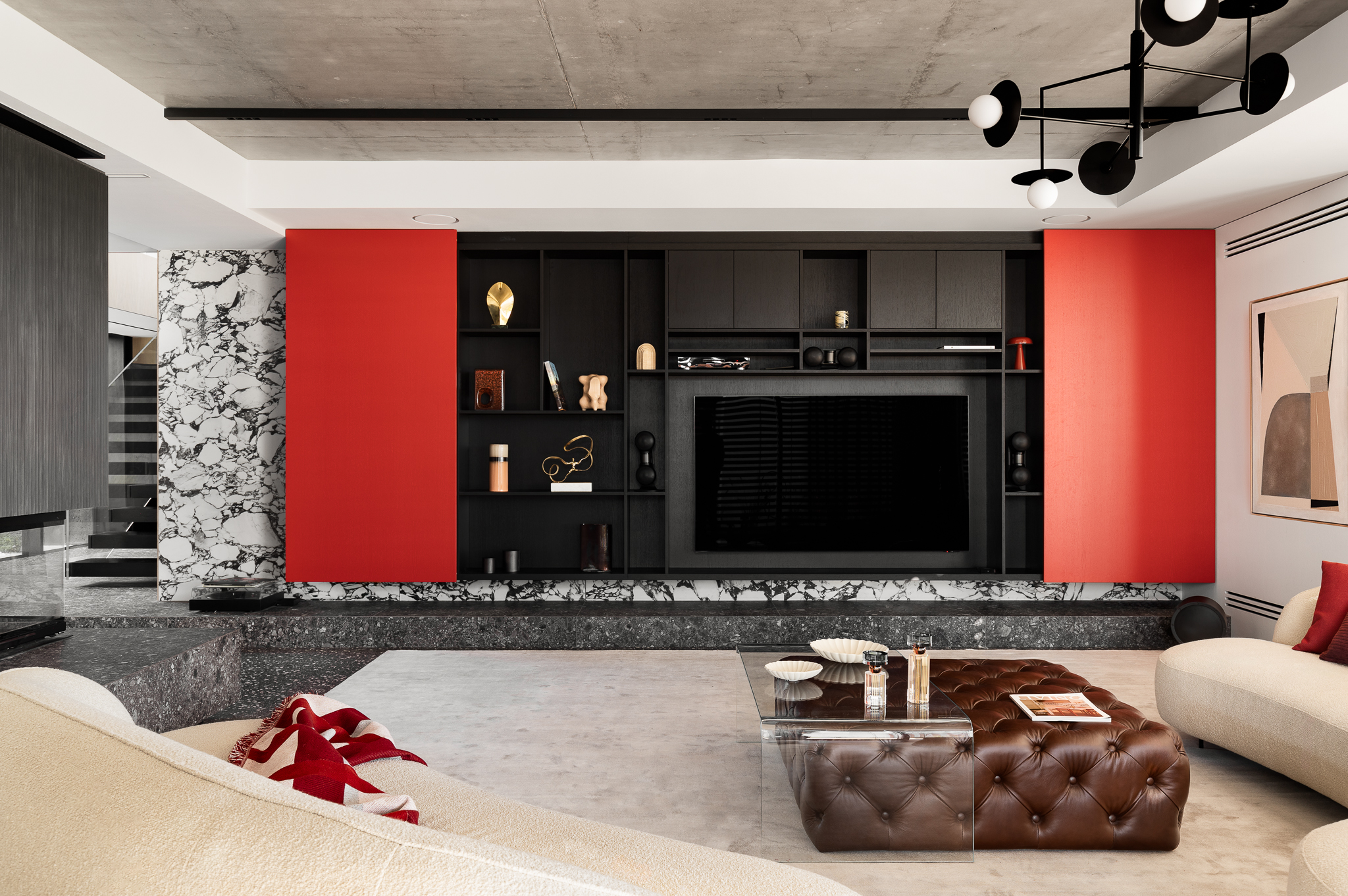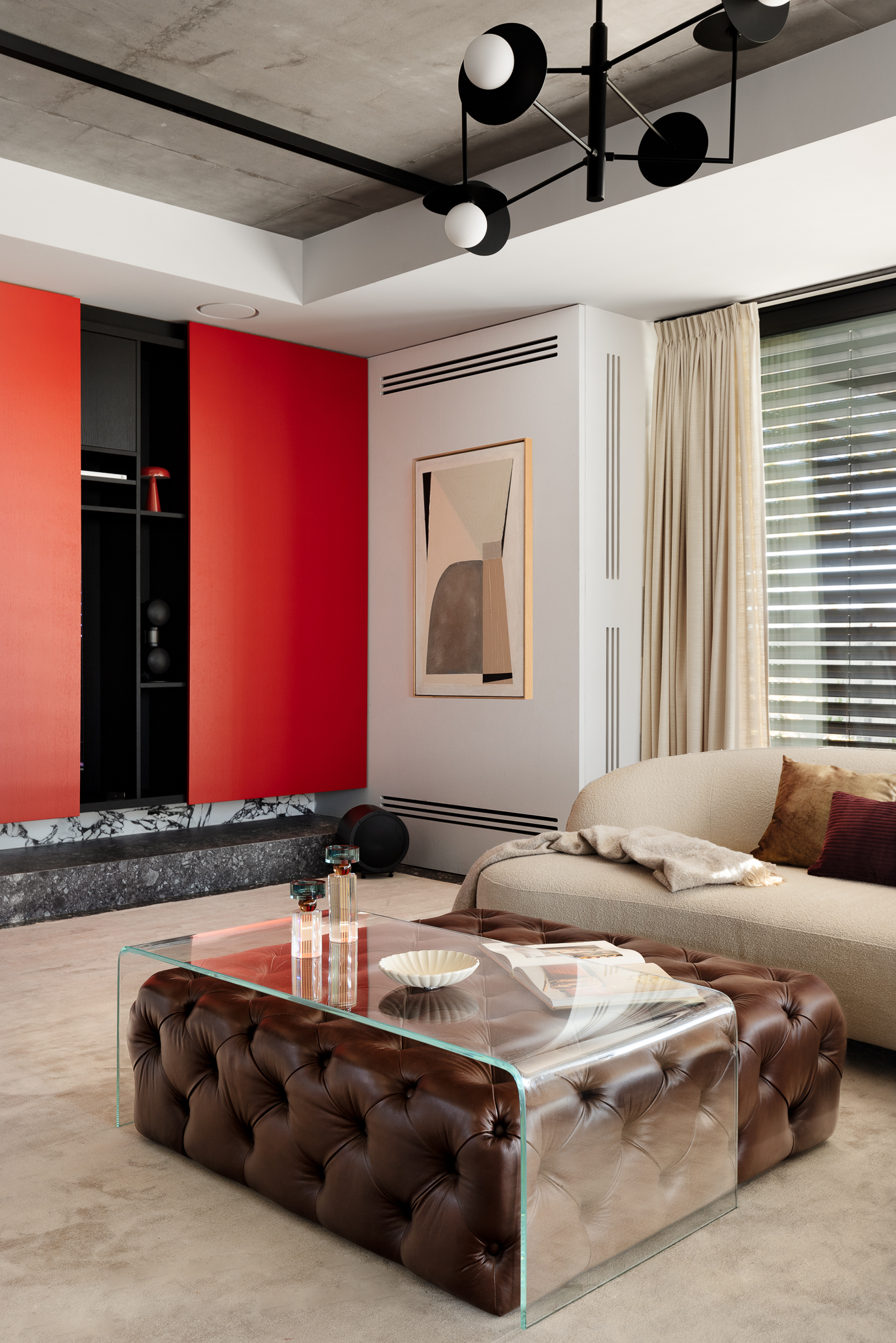 Kontrastowe zestawienia — meble o organicznych kształtach, tekstylia o wyrazistych splotach i dywany — wprowadzają równowagę i przytulność. Zabudowa RTV skrywa telewizor oraz kolekcję płyt winylowych za ruchomymi panelami z drewna barwionego na ognistą czerwień. Sztuka jest nieodłącznym elementem aranżacji — w domu wiszą między innymi prace Natalii Załuskiej oraz kultowe lustro Rondo autorstwa Oskara Zięty.