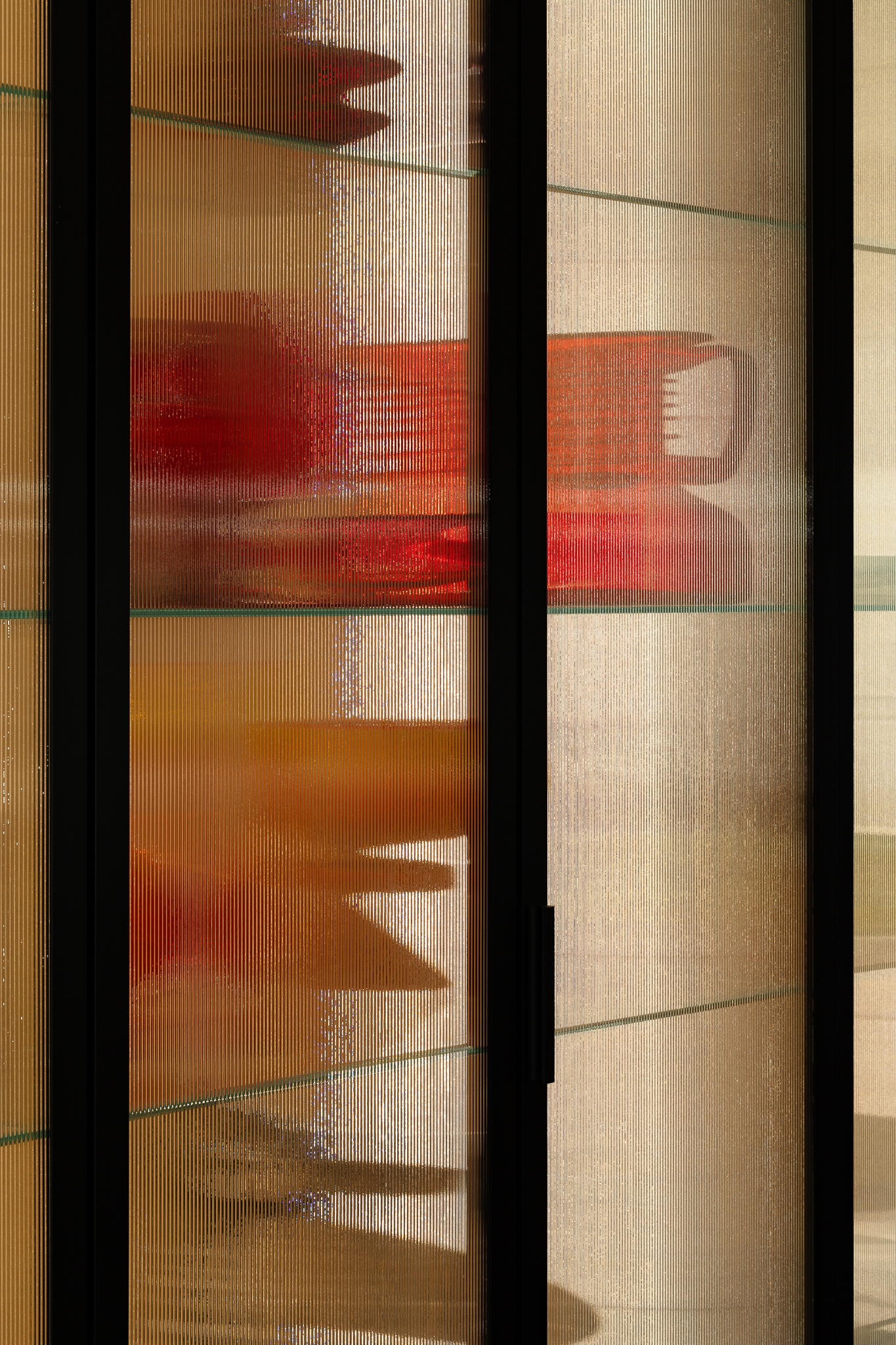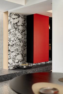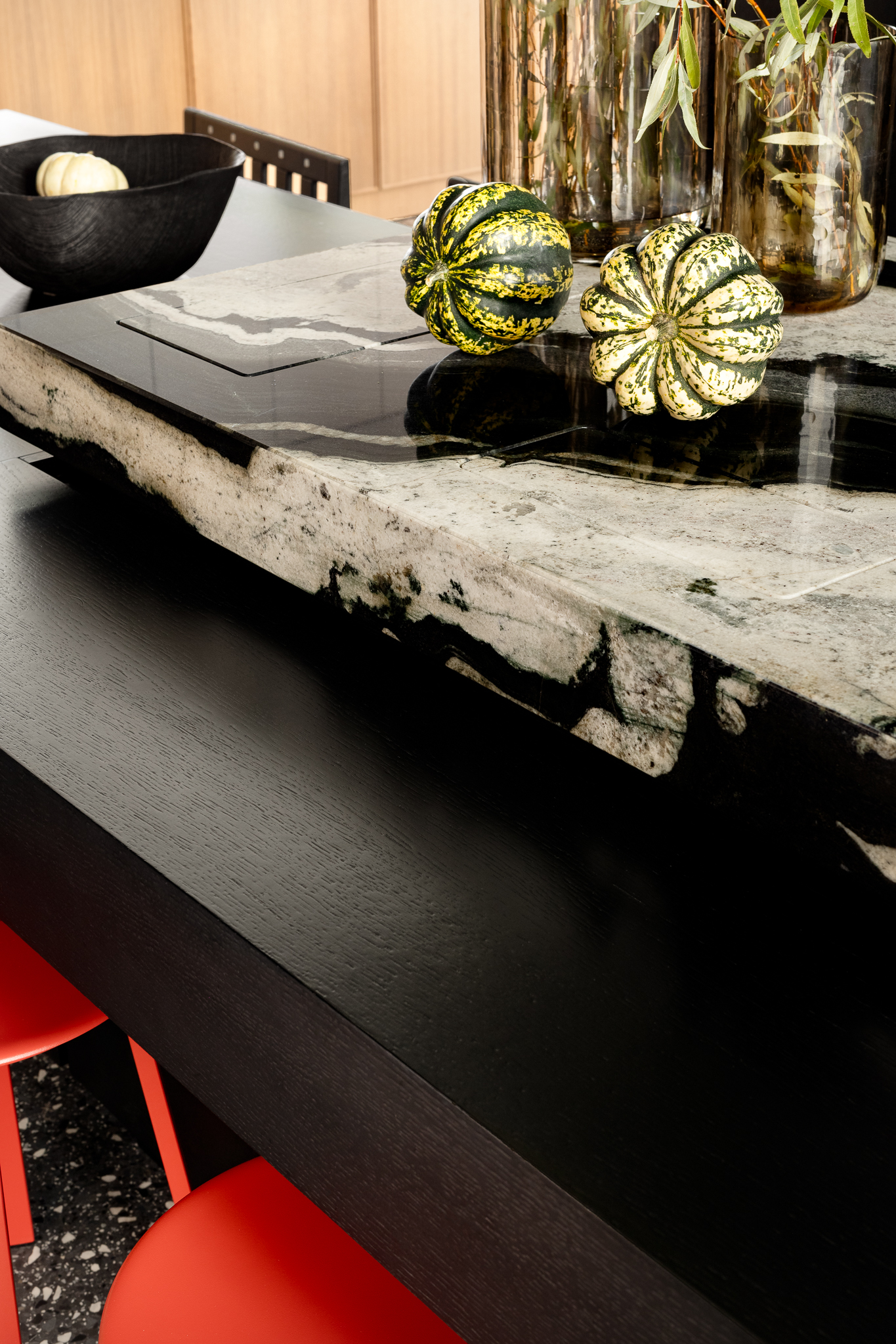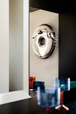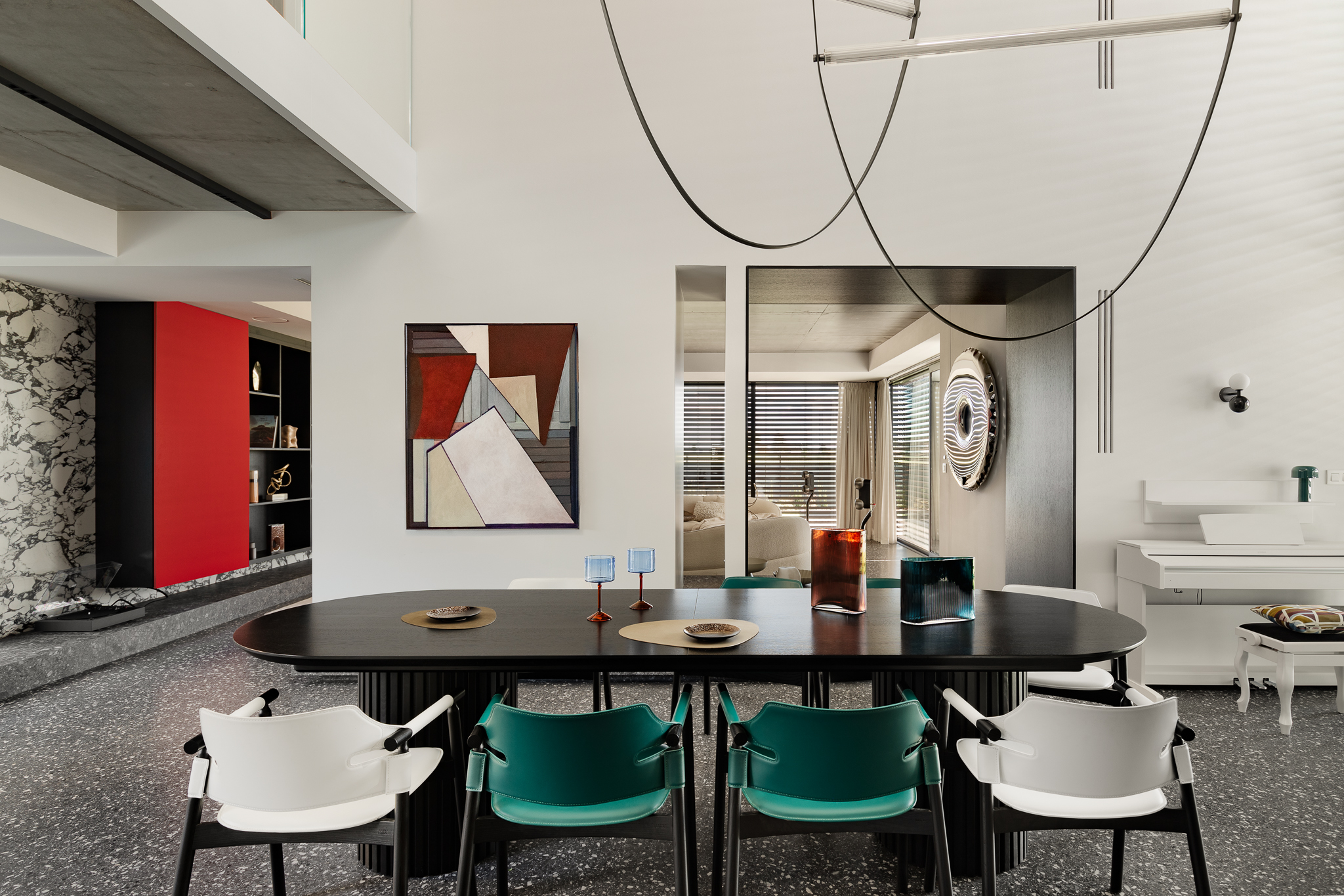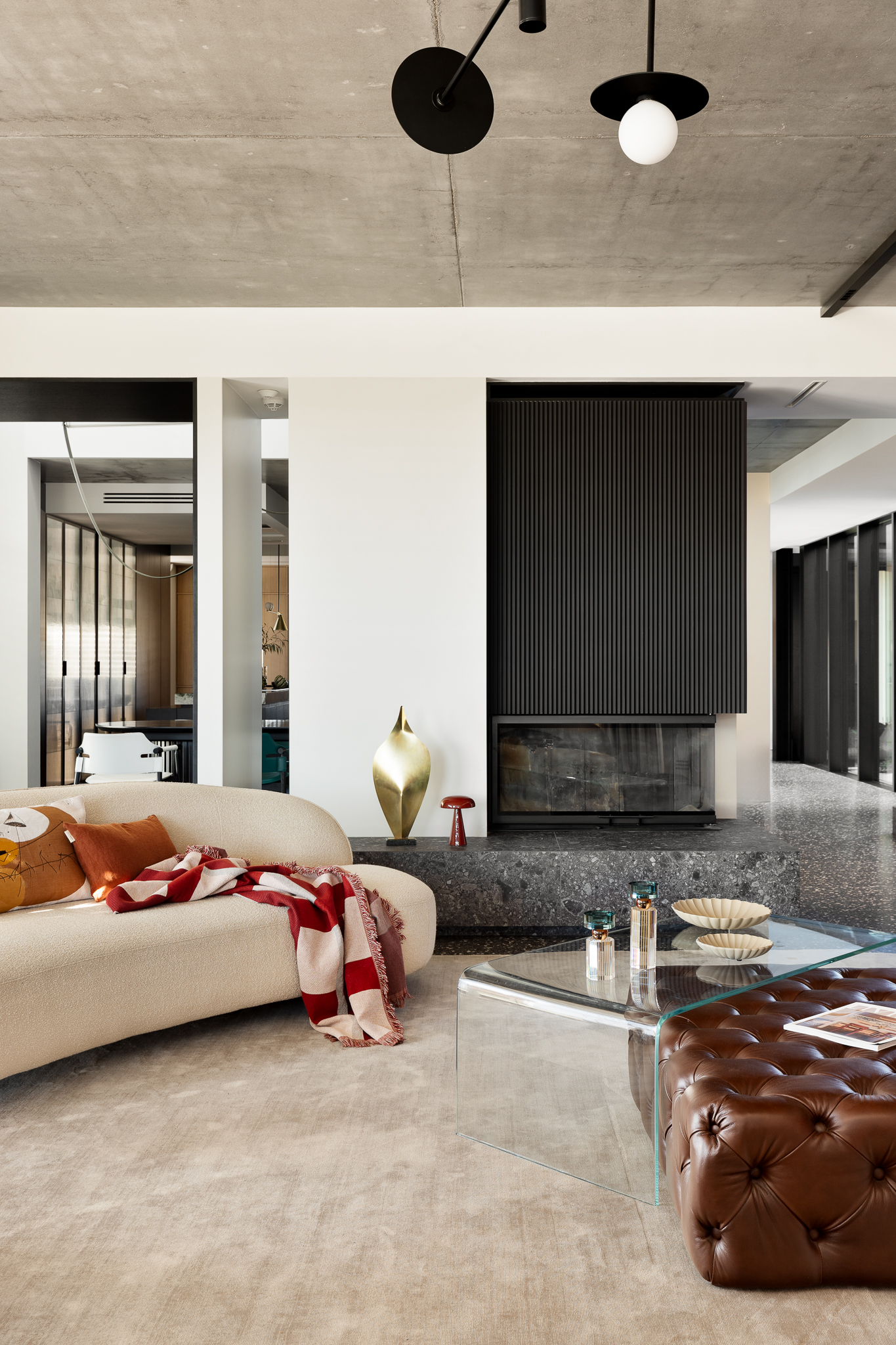 Kontrastowe zestawienia — meble o organicznych kształtach, tekstylia o wyrazistych splotach i dywany — wprowadzają równowagę i przytulność. Zabudowa RTV skrywa telewizor oraz kolekcję płyt winylowych za ruchomymi panelami z drewna barwionego na ognistą czerwień. Sztuka jest nieodłącznym elementem aranżacji — w domu wiszą między innymi prace Natalii Załuskiej oraz kultowe lustro Rondo autorstwa Oskara Zięty.