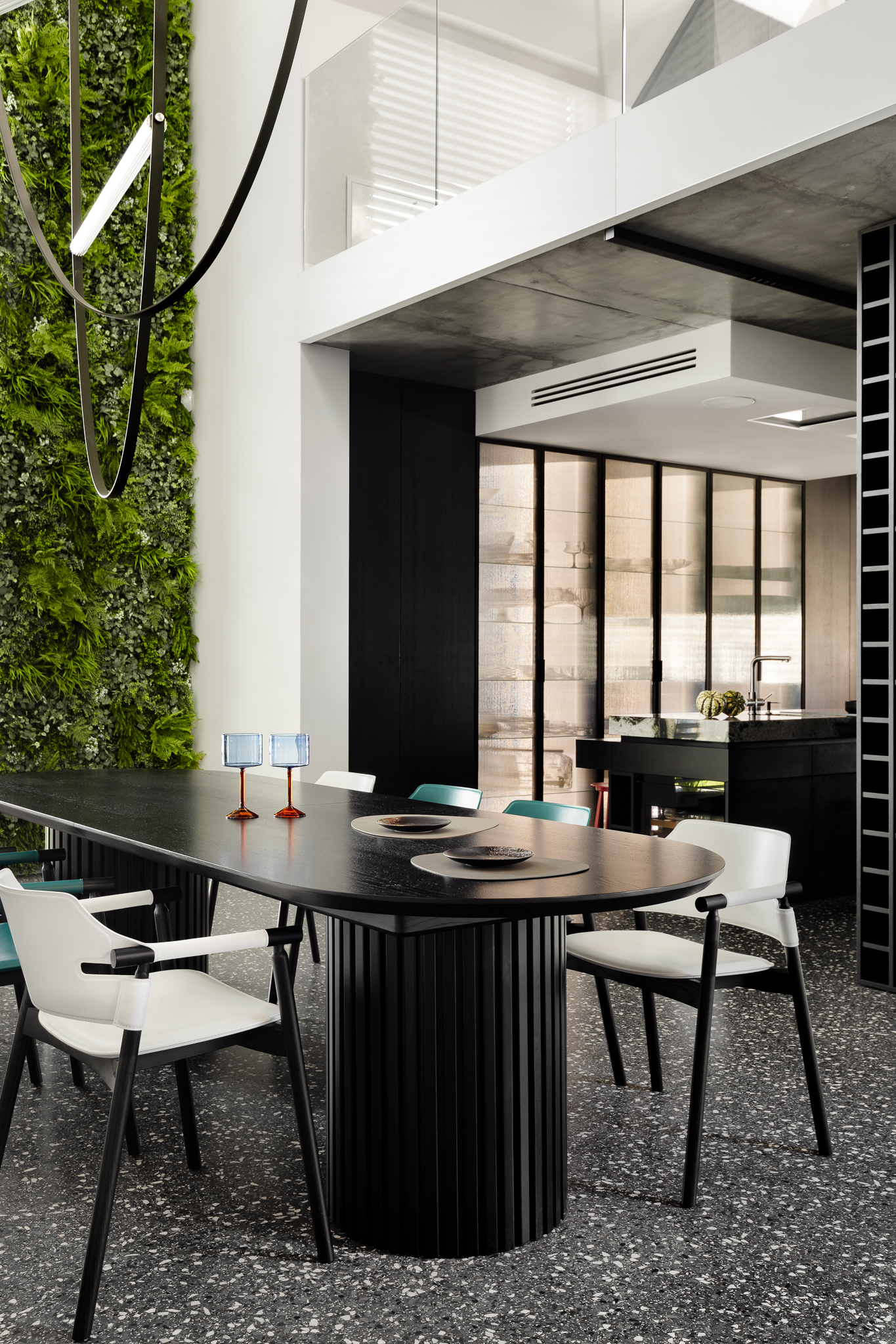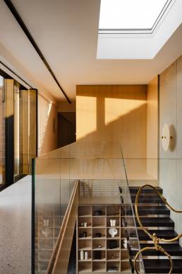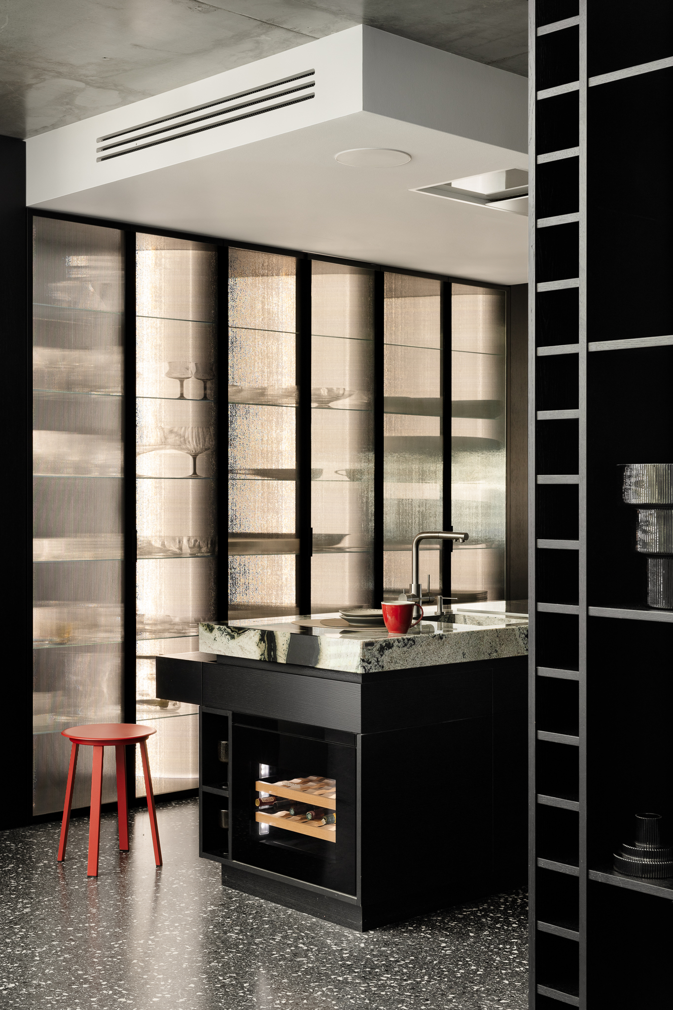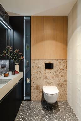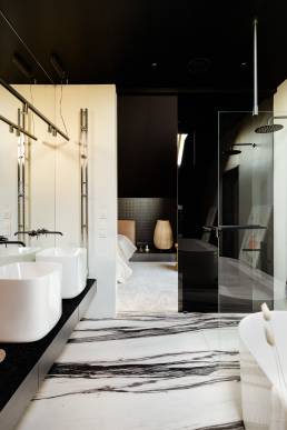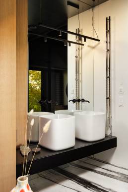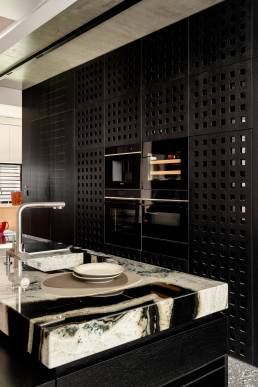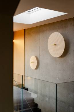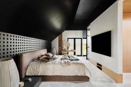 Inwestorzy, poszukując dodatkowej przestrzeni dla powiększającej się rodziny, zdecydowali się na rozbudowę domu o 280 m². W nowej części powstała strefa dzienna z dwiema kuchniami — otwartą i roboczą — łazienka dla gości oraz główna sypialnia z prywatną łazienką i garderobą. Nowa bryła o wyrazistej, geometrycznej formie łączy zaawansowane rozwiązania technologiczne: rekuperację, klimatyzację oraz ukryte nagłośnienie, dyskretnie wkomponowane w strukturę wnętrza.