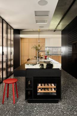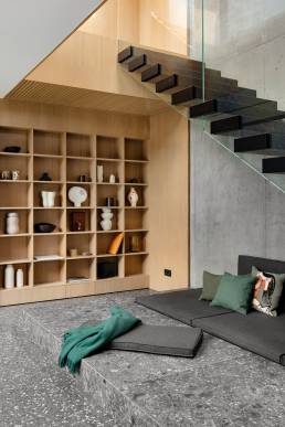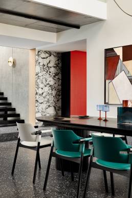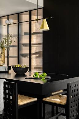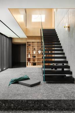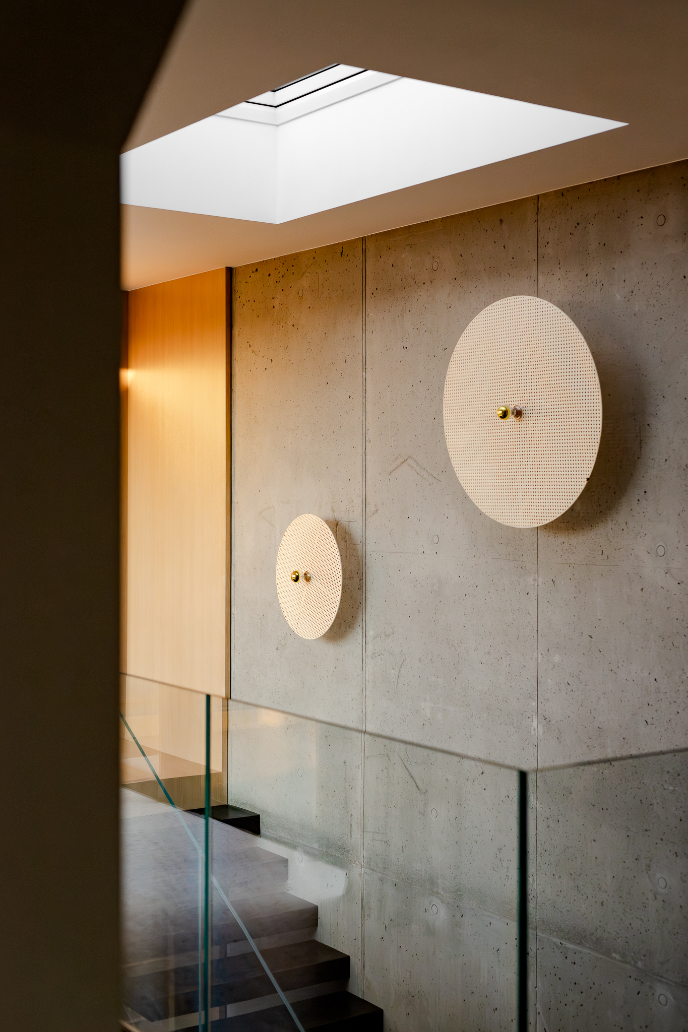 Projekt zakładał połączenie starej i nowej części domu. Dominują stonowane szarości, głęboka czerń i naturalne odcienie drewna. Miejsce połączenia obu części podkreślono zestawieniem surowych betonowych ścian i sufitów. Na podłogach króluje lastryko, które wprowadza spójność stylistyczną. Inspiracją dla koncepcji wnętrza było krzesło Charlesa Renniego Mackintosha — jego ażurowa forma znalazła odzwierciedlenie w zabudowie kuchennej i dekoracyjnej ścianie w sypialni. Motyw plecionki przewija się w całym domu, od lamp na klatce schodowej po oprawy w głównej sypialni.