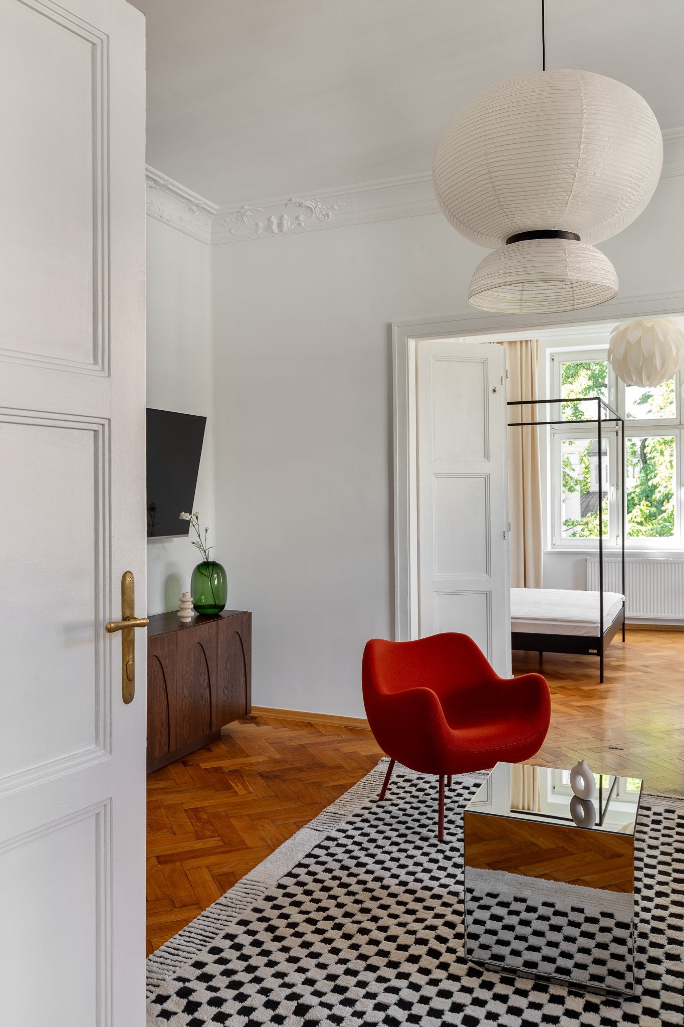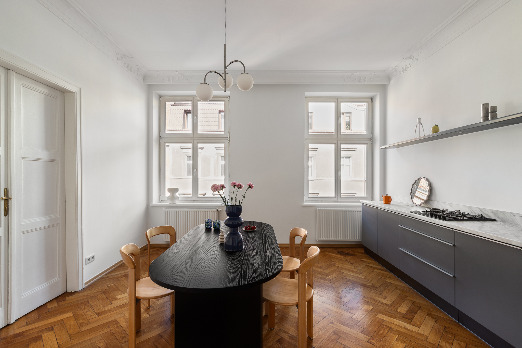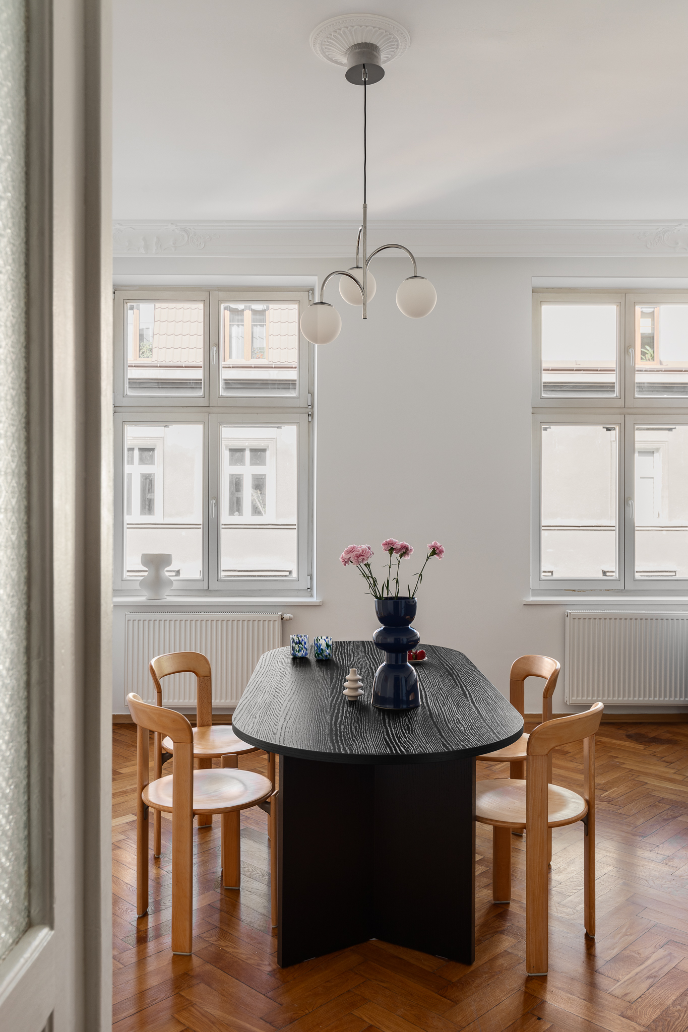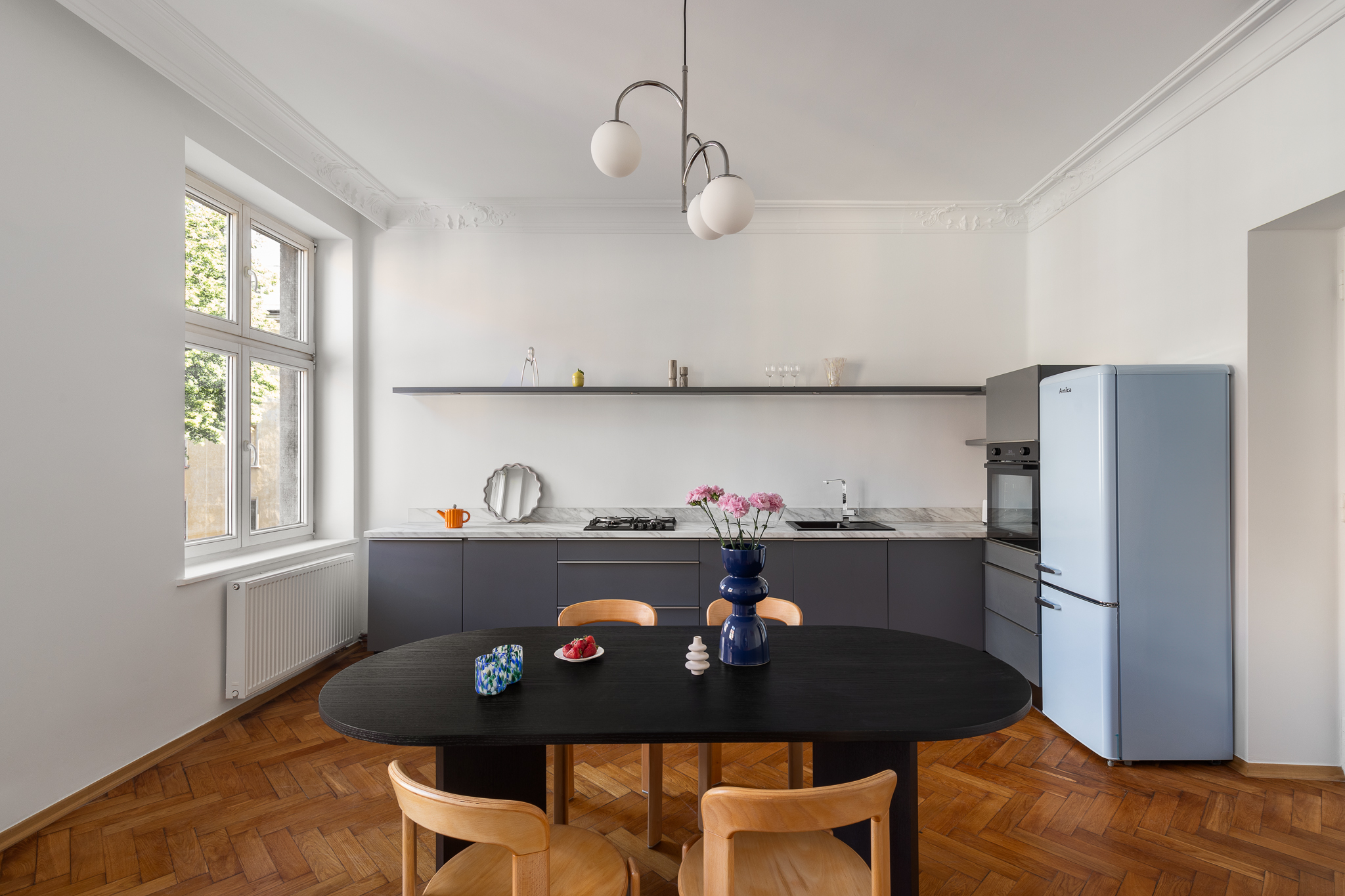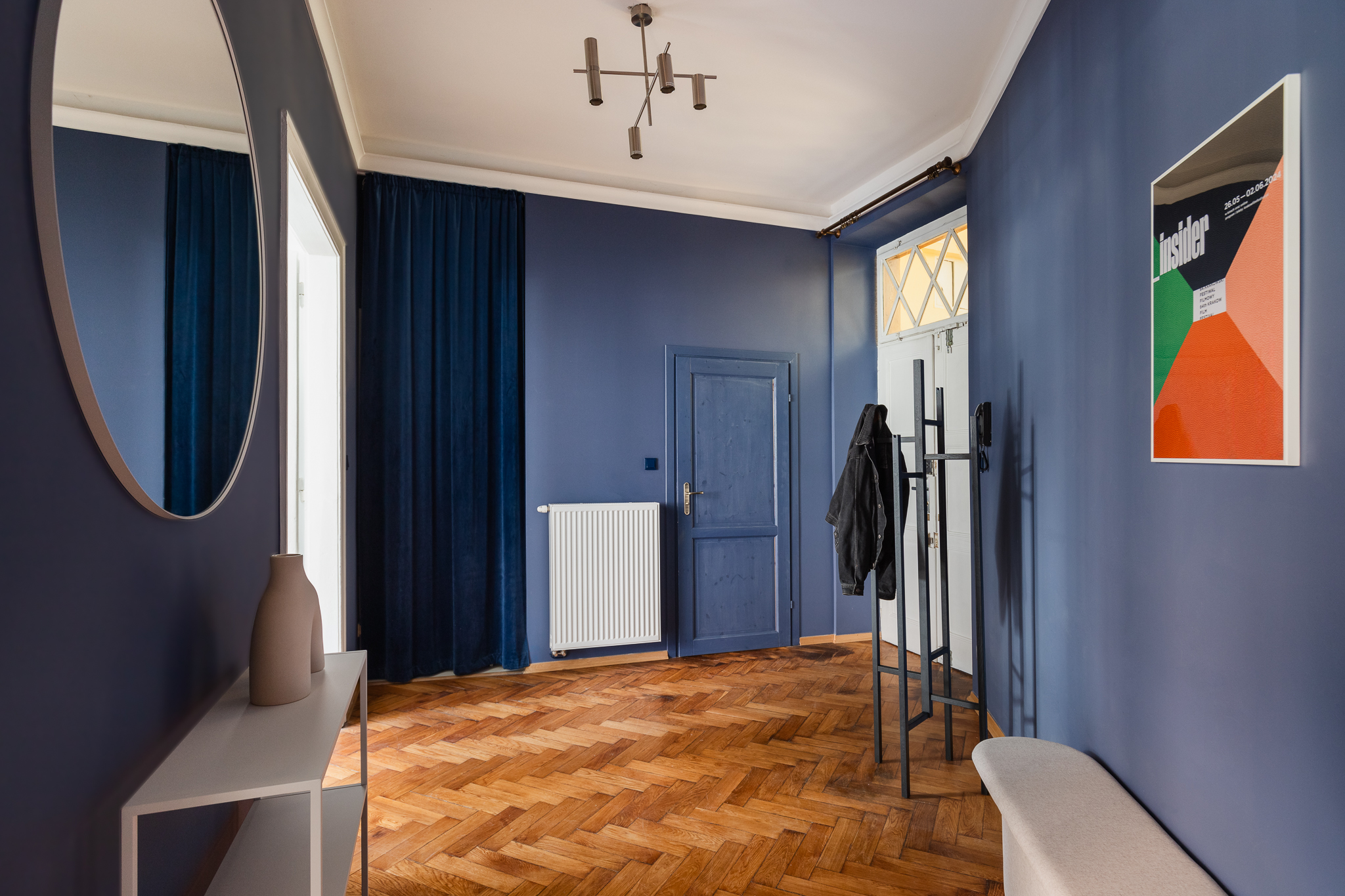 Inwestorowi zależało na wnętrzu wyróżniającym się na tle innych ofert na rynku krótkoterminowym — nieszablonowym designem i wysokim standardem. Agata Popieluch stanęła przed wyzwaniem urządzenia już wykończonej przestrzeni bez dużych zmian. Do gotowych pomieszczeń z odnowionym starym parkietem i oryginalną stolarką dobrała meble, oświetlenie i dodatki. Dodała sztukaterię w formie rozet i listew przysufitowych, które podkreśliły charakter kamienicy.