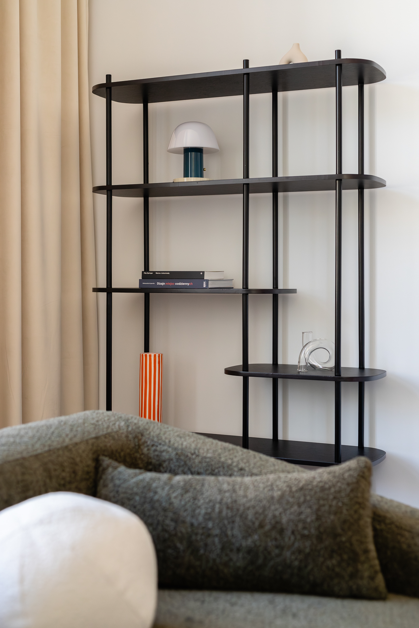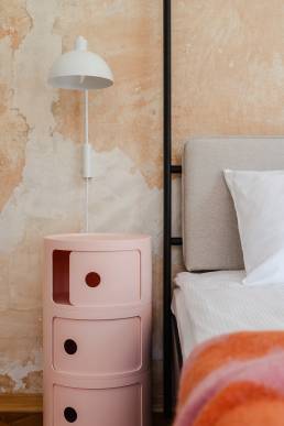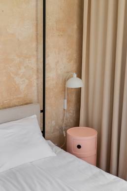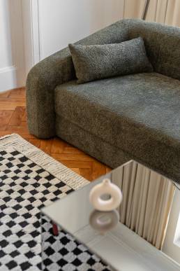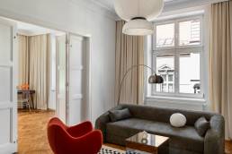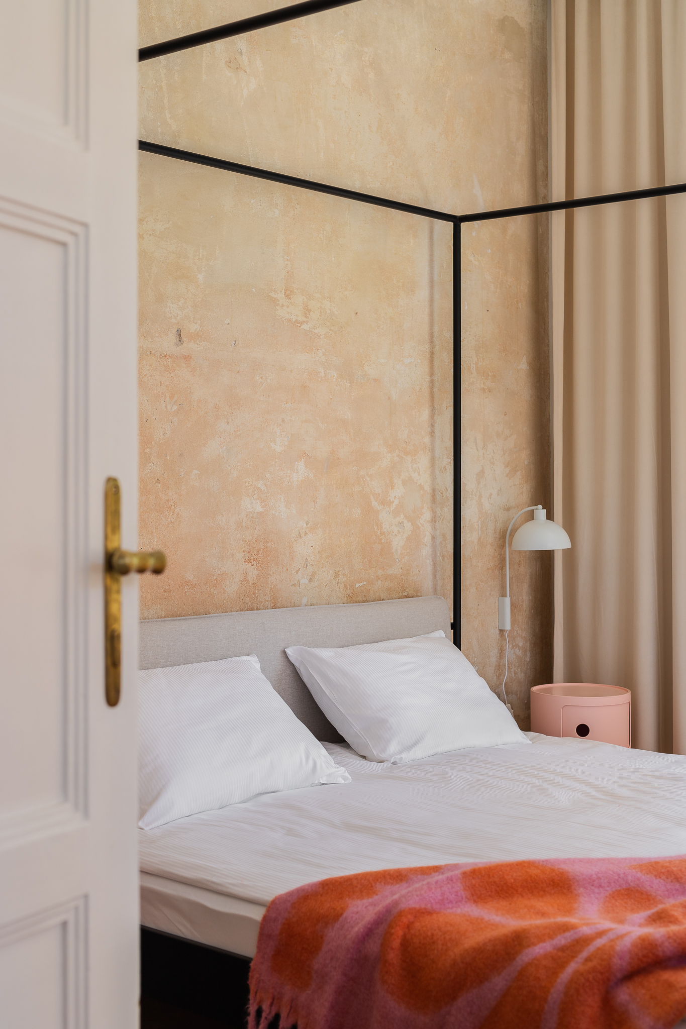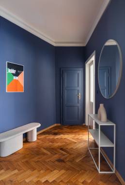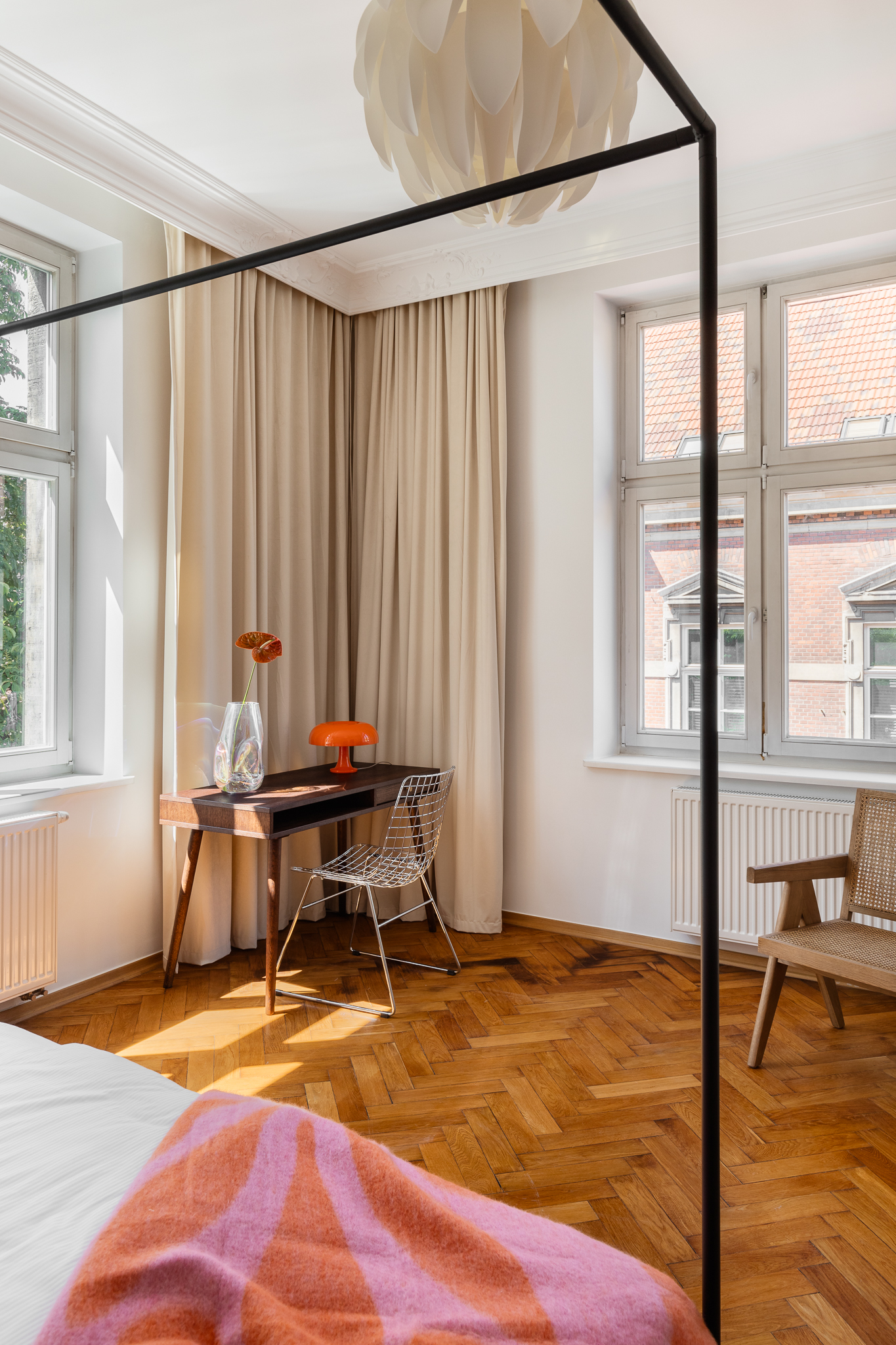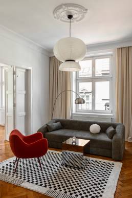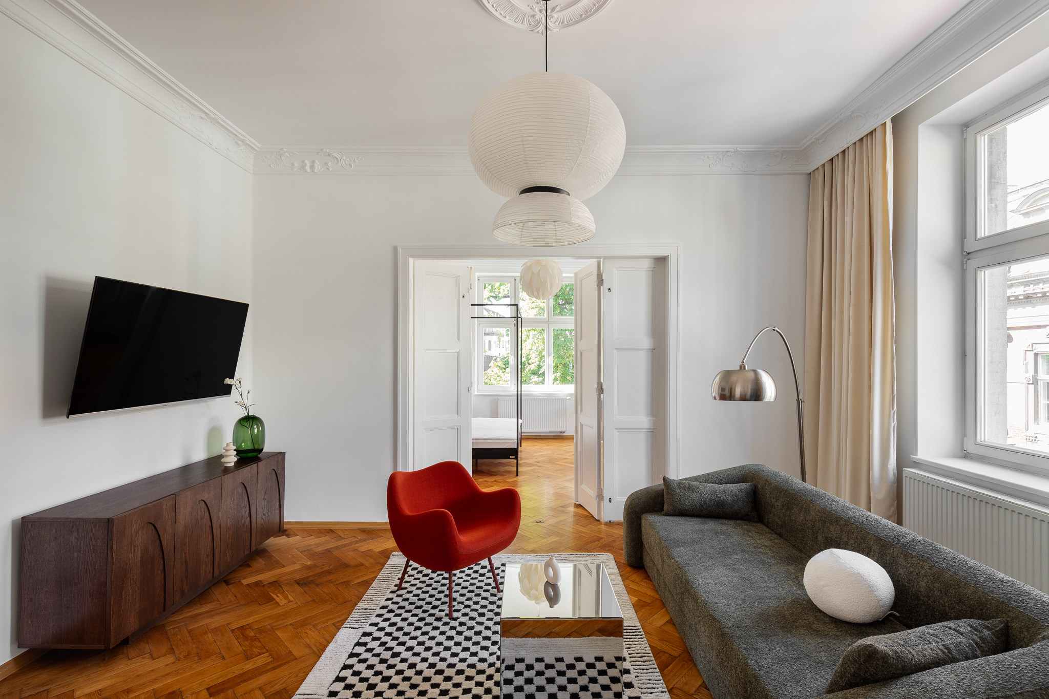 Inwestorowi zależało na wnętrzu wyróżniającym się na tle innych ofert na rynku krótkoterminowym — nieszablonowym designem i wysokim standardem. Agata Popieluch stanęła przed wyzwaniem urządzenia już wykończonej przestrzeni bez dużych zmian. Do gotowych pomieszczeń z odnowionym starym parkietem i oryginalną stolarką dobrała meble, oświetlenie i dodatki. Dodała sztukaterię w formie rozet i listew przysufitowych, które podkreśliły charakter kamienicy.
