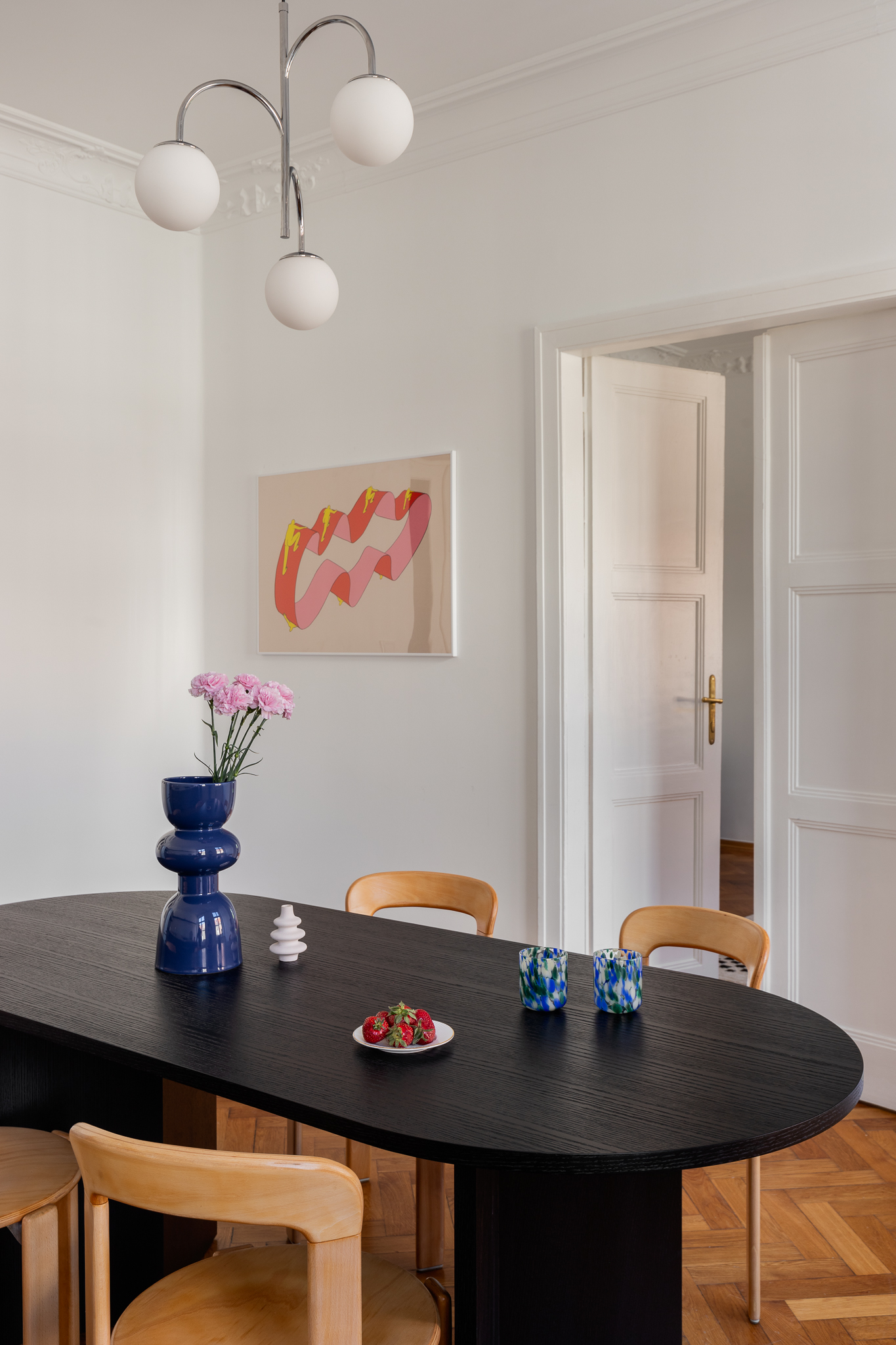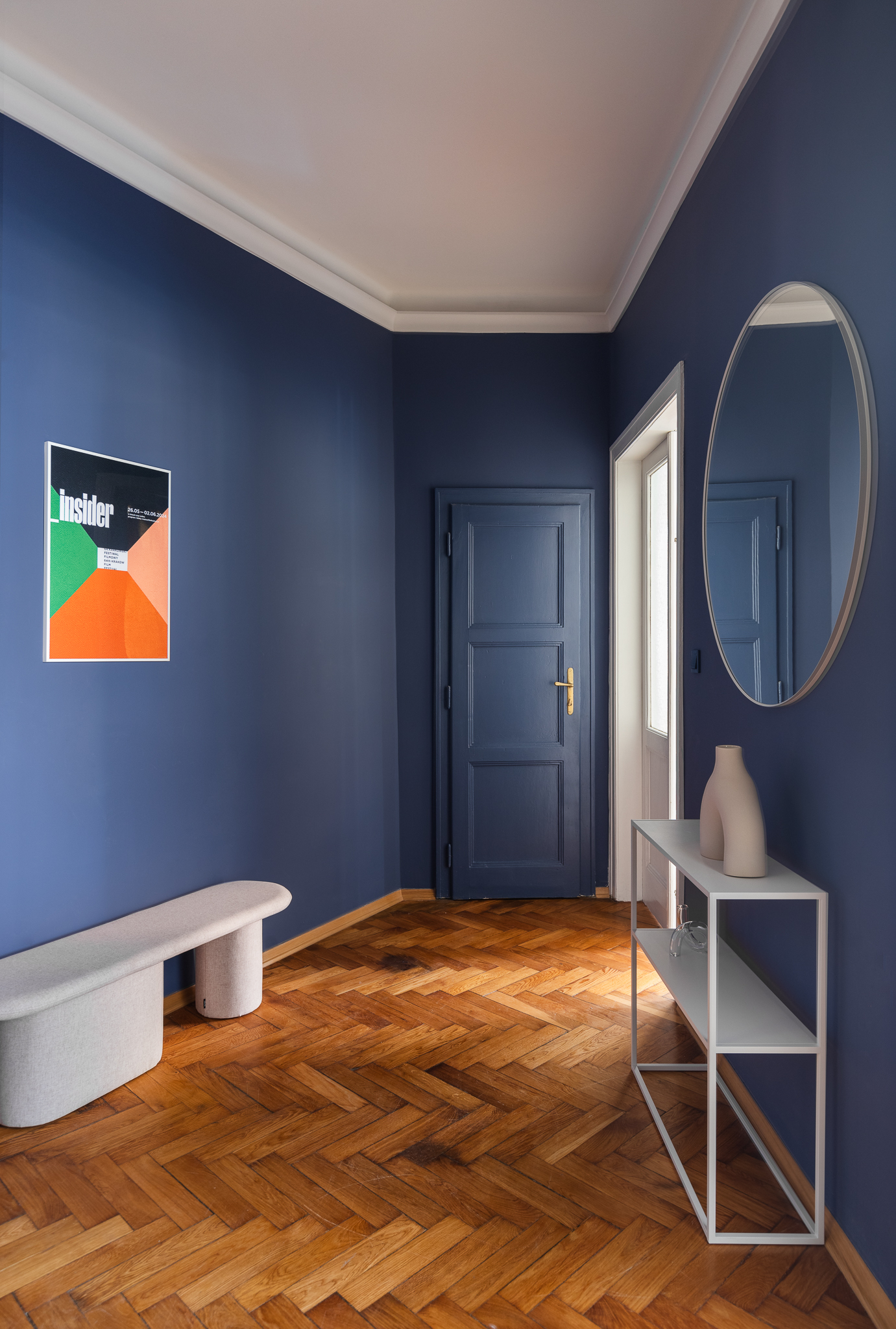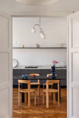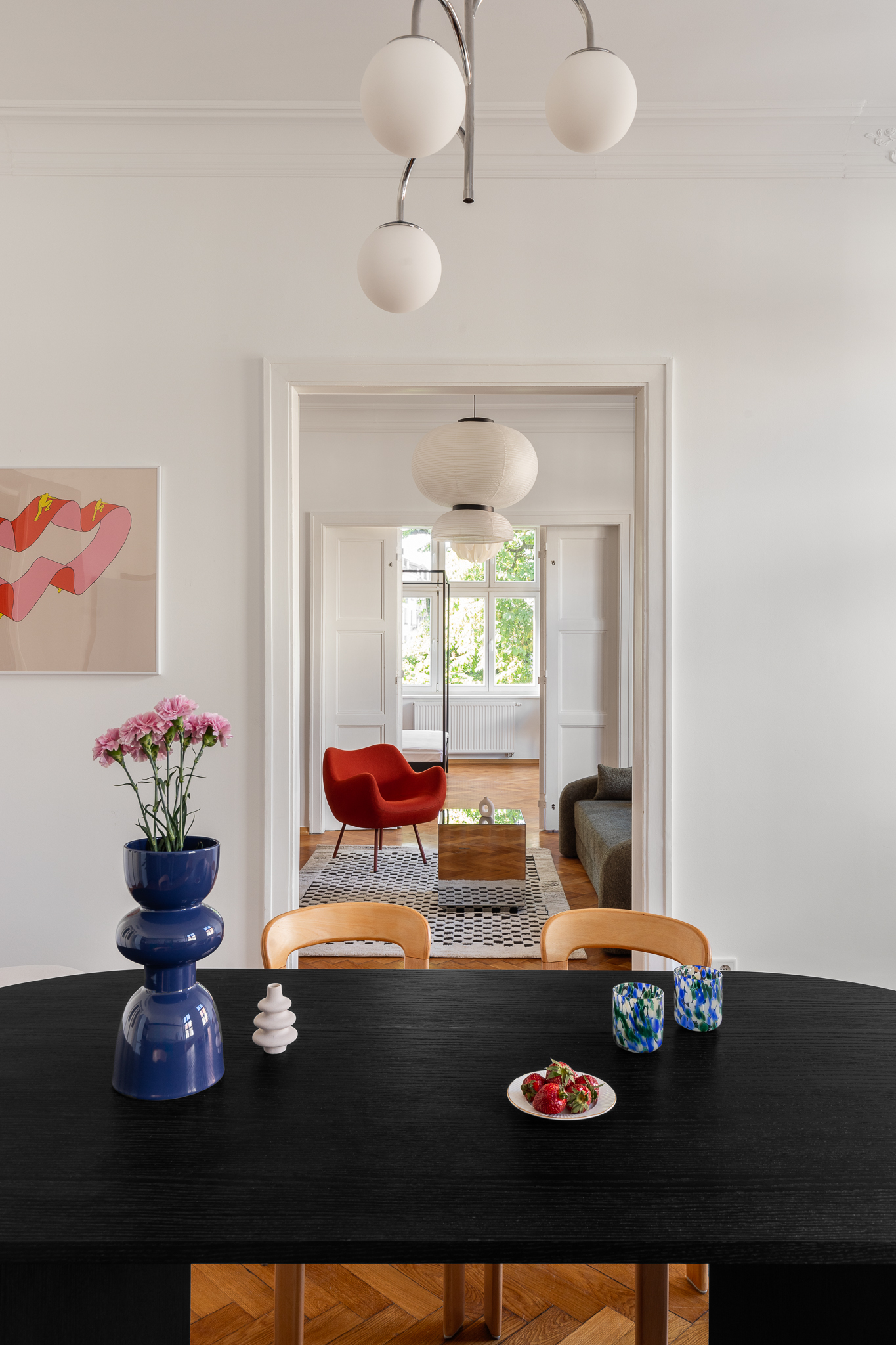 Mieszkanie w układzie amfiladowym — kuchnia z jadalnią, salon, sypialnia — prowadzi gości przez kolejne strefy, z których każda ma osobny charakter, ale wszystkie łączy ta sama idea: klasyka podkręcona odważnym kolorem.