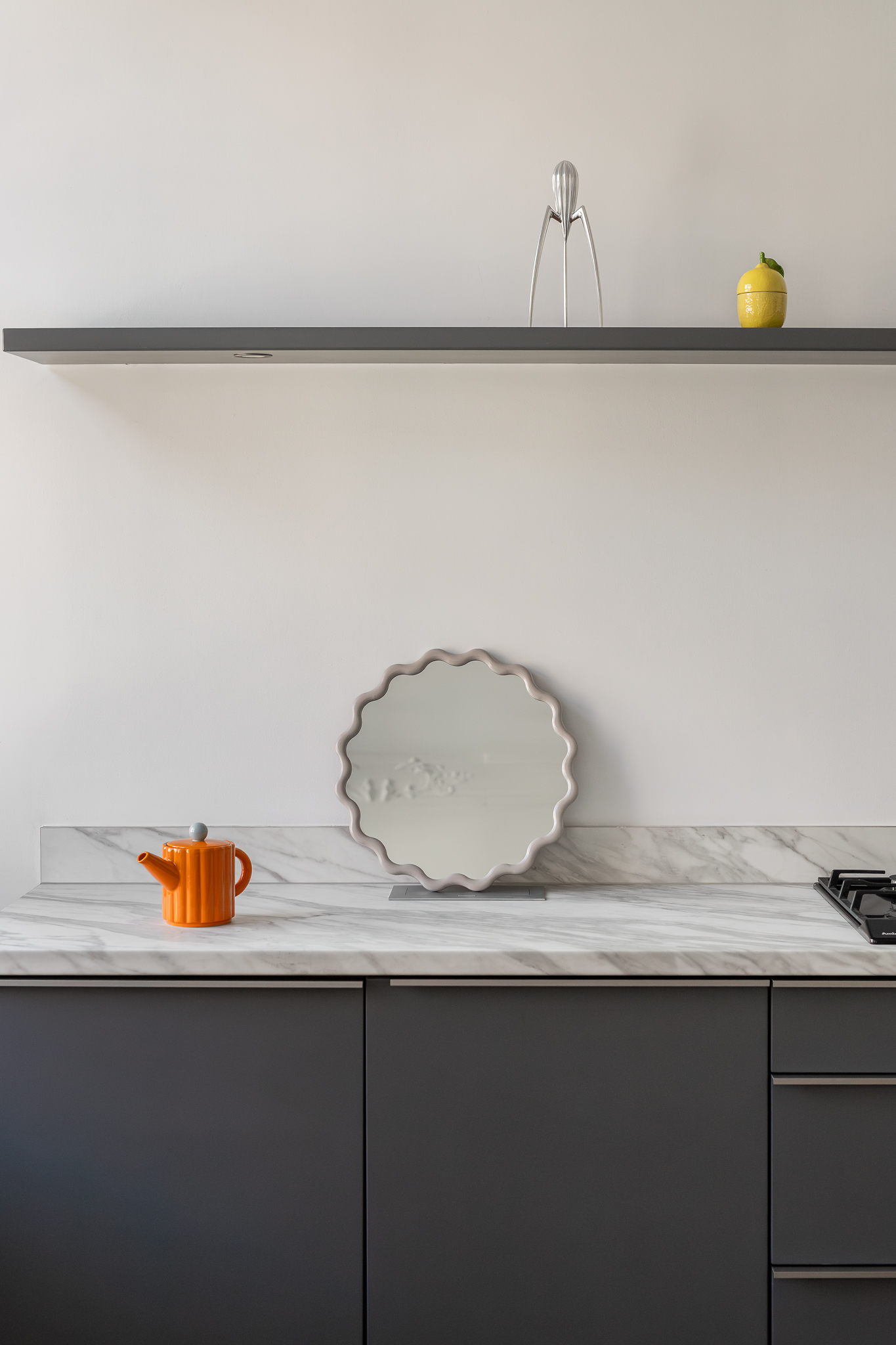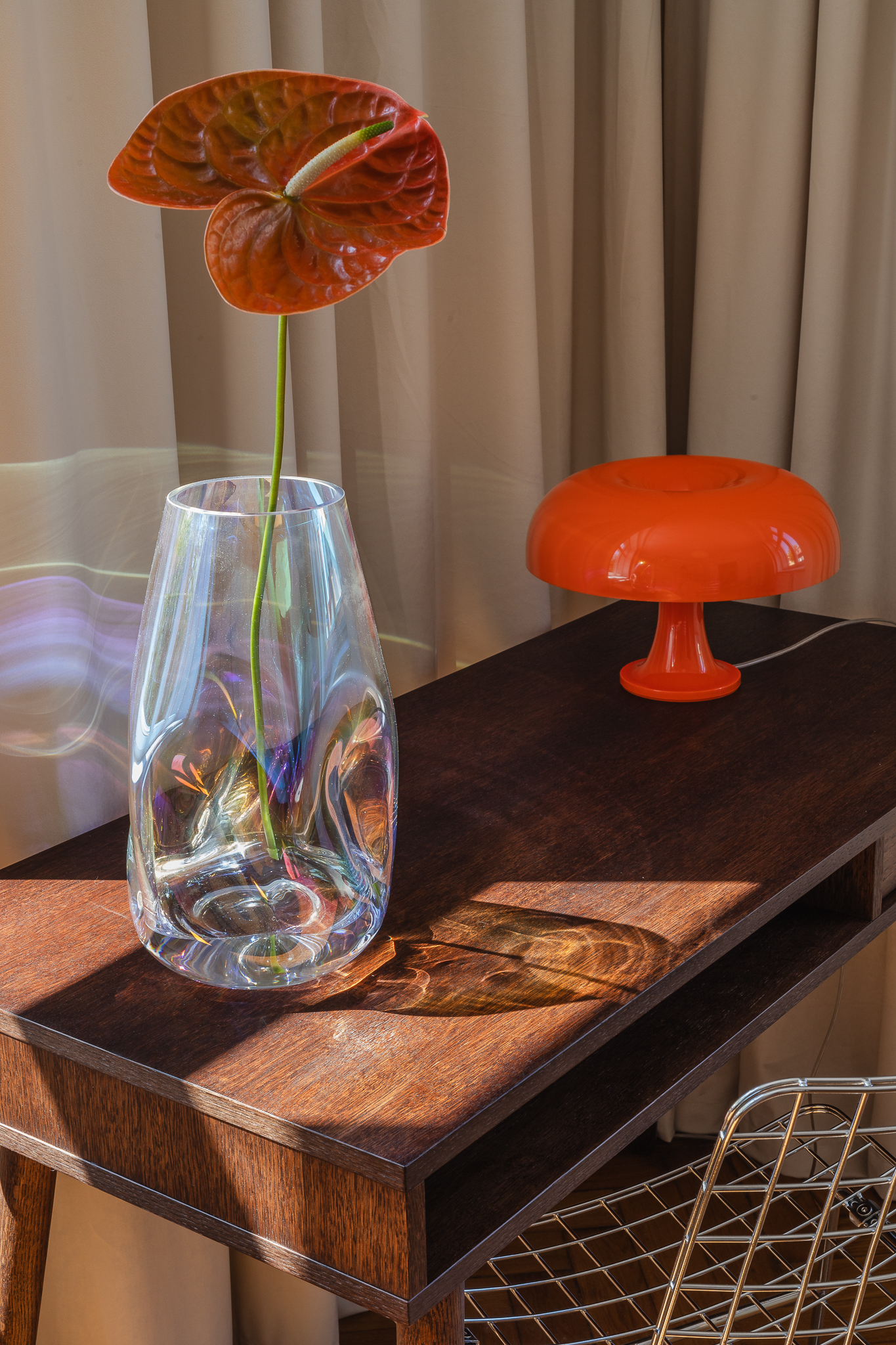 Główna idea projektu to zachowanie przestronności i oddech w każdym pomieszczeniu — stąd łóżko z baldachimem ustawione w centrum sypialni i sofa na środku salonu. Białe ściany w większości pomieszczeń tworzą neutralną bazę dla wyrazistych akcentów kolorystycznych. Granatowa strefa wejściowa, jasnoniebieska lodówka, czerwony fotel RM58 w salonie i pomarańczowo-różowe detale z chromowanymi wykończeniami nawiązują do stylu retro, który doskonale komponuje się z klimatem starej krakowskiej kamienicy.