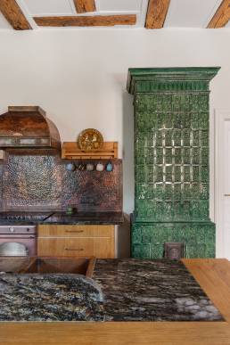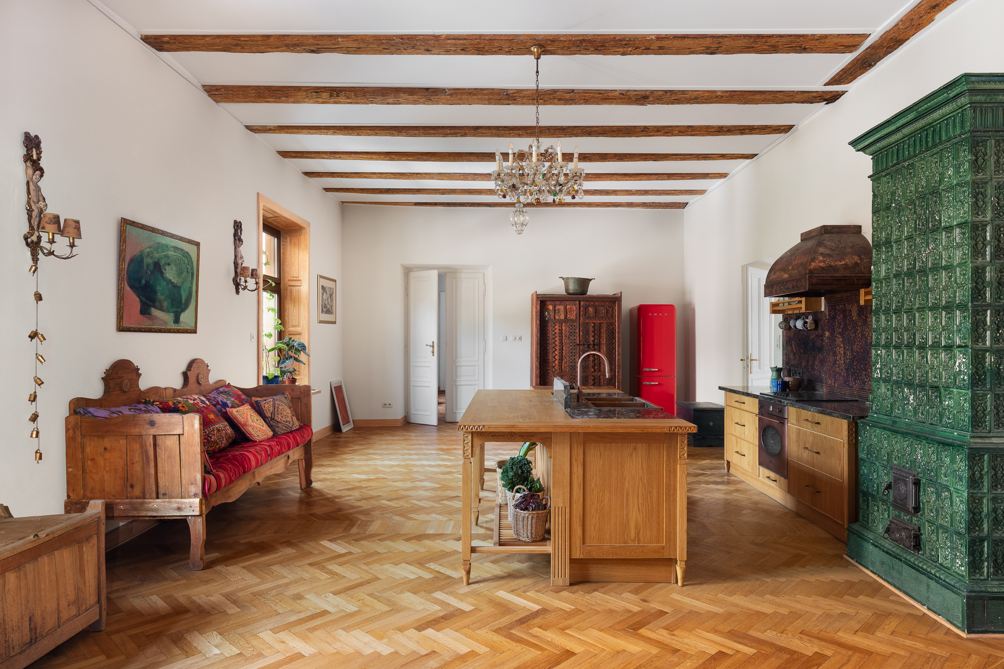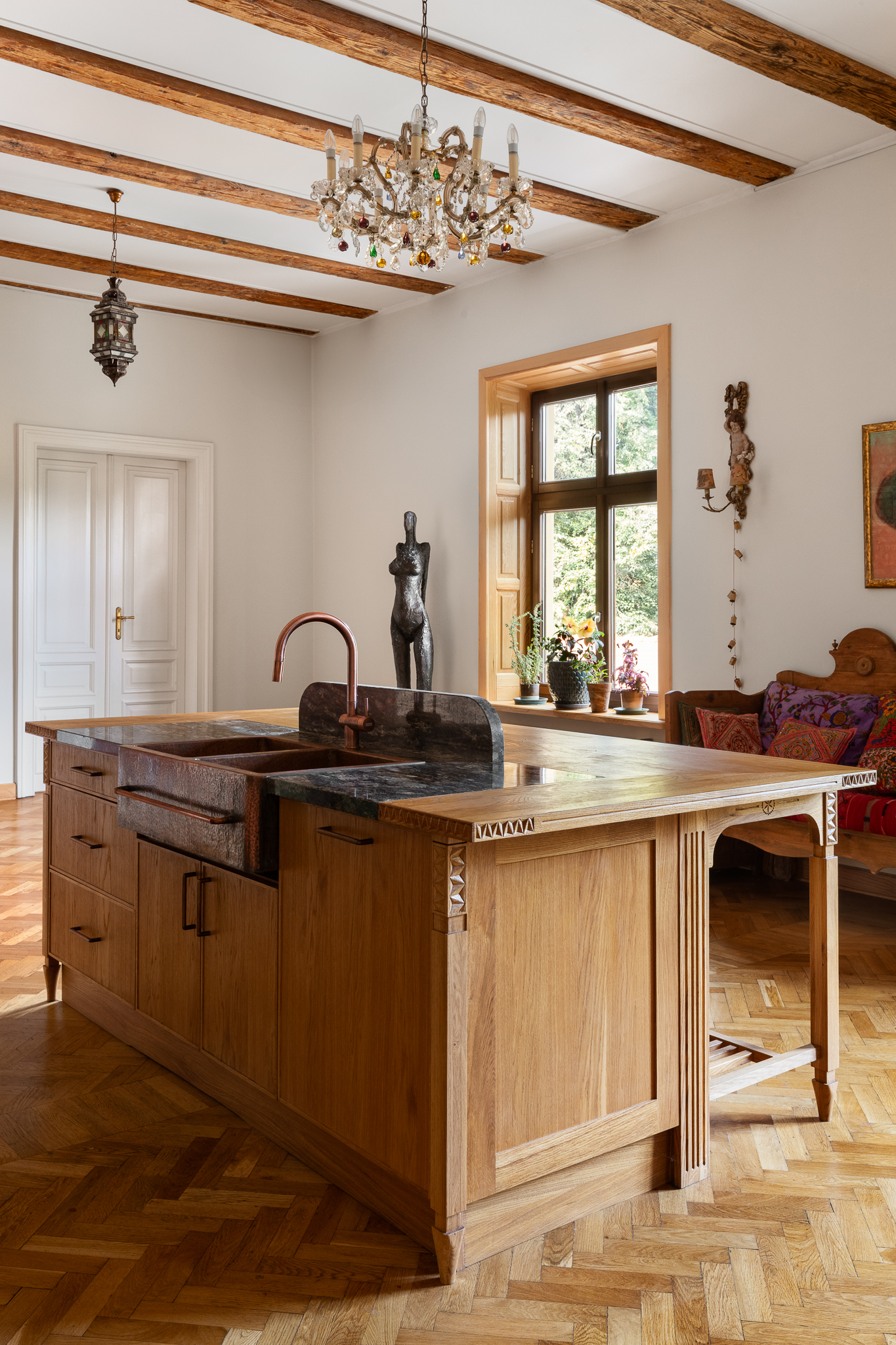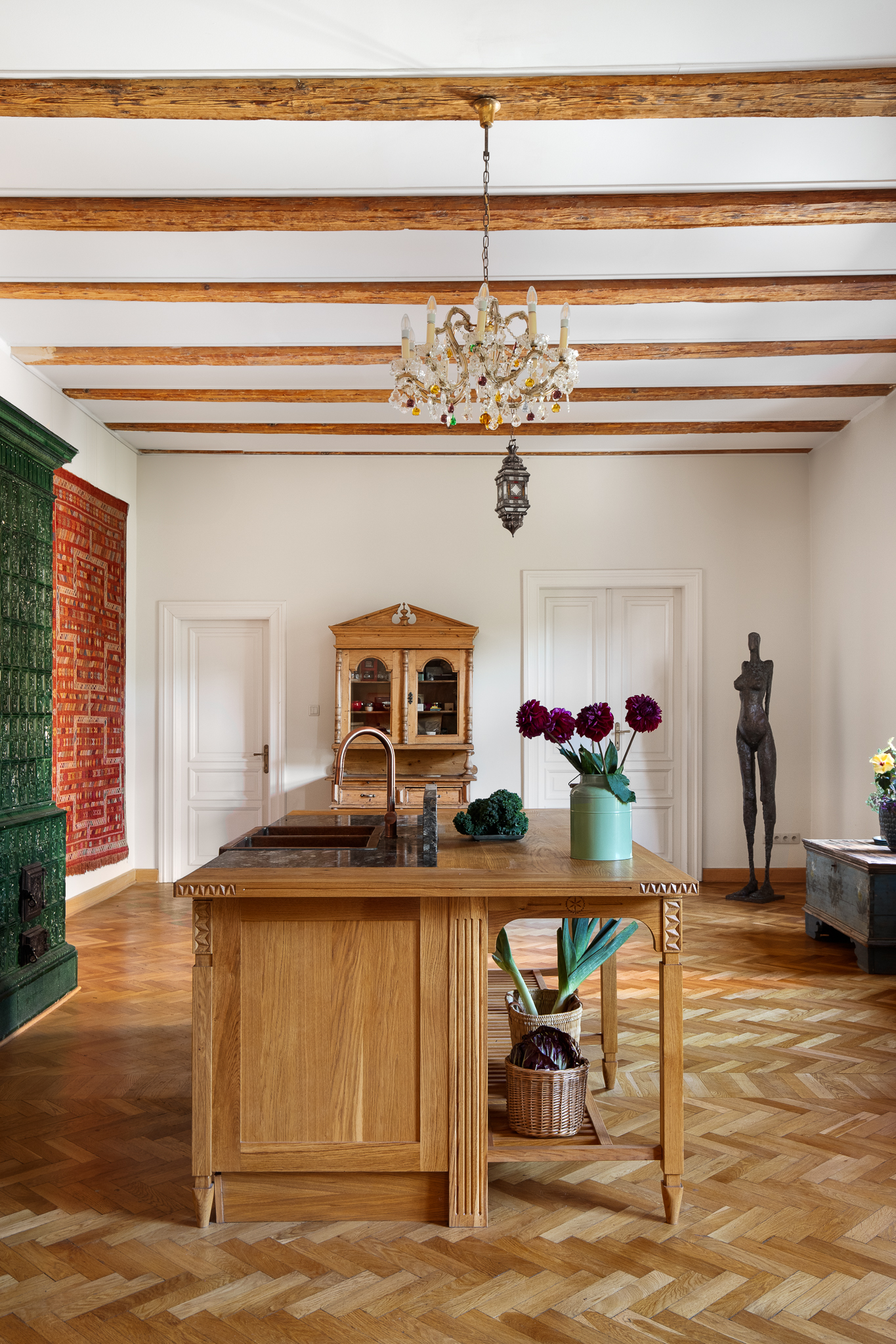 Przestrzeń emanowała naturalnym pięknem od samego początku — bardzo wysokie sufity, zabytkowa stolarka, stare parkiety i imponujące piece kaflowe. Jeden z nich, w kolorze malachitowym, został przeniesiony w sąsiedztwo kuchni, co wymagało cierpliwej pracy doświadczonego zduna. Inspiracją stała się fascynacja właściciela wschodnią kulturą — otwarty tryb życia, zamiłowanie do kolorów, rzemiosła i antyków z różnych zakątków świata dyktowały kierunek estetyczny.