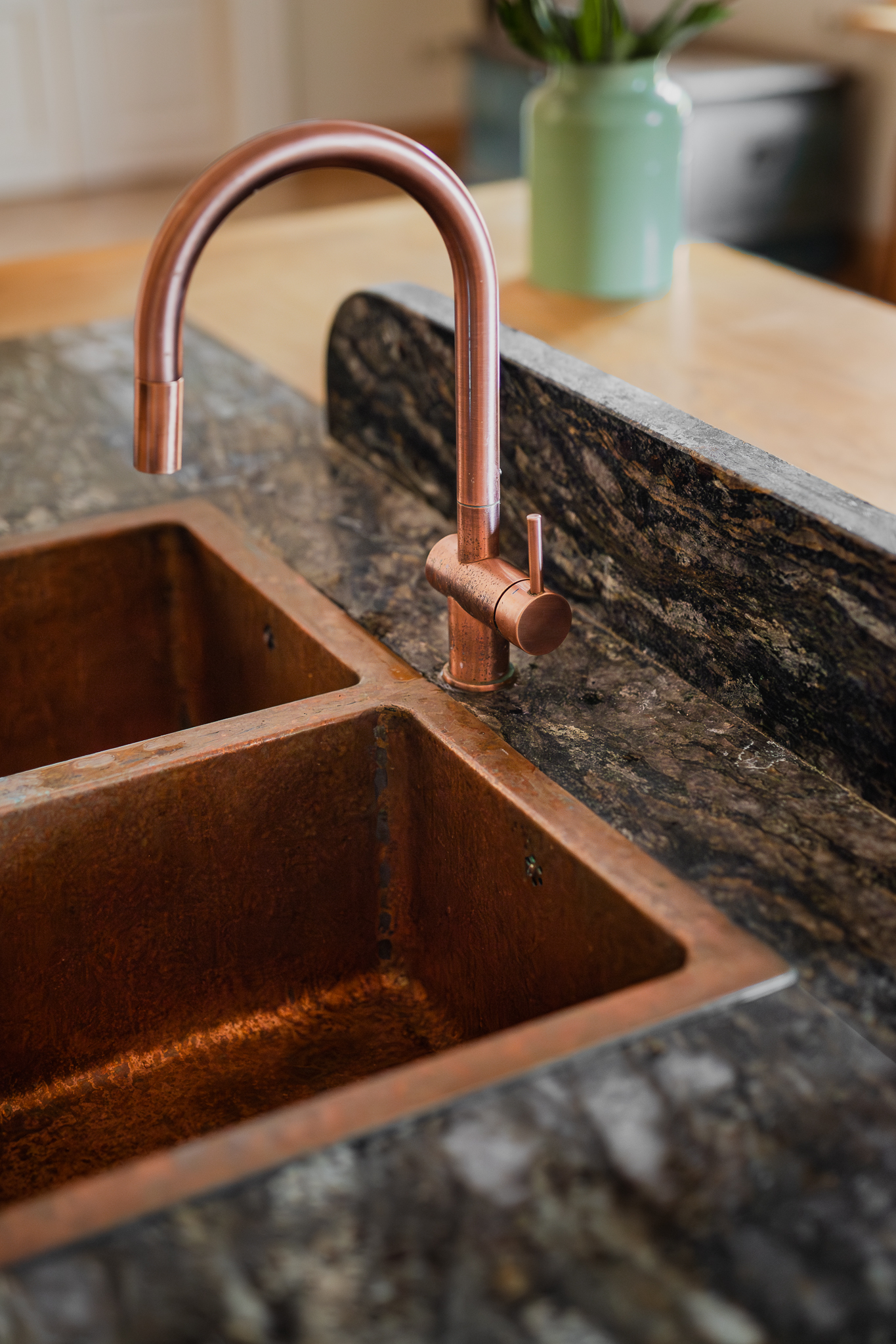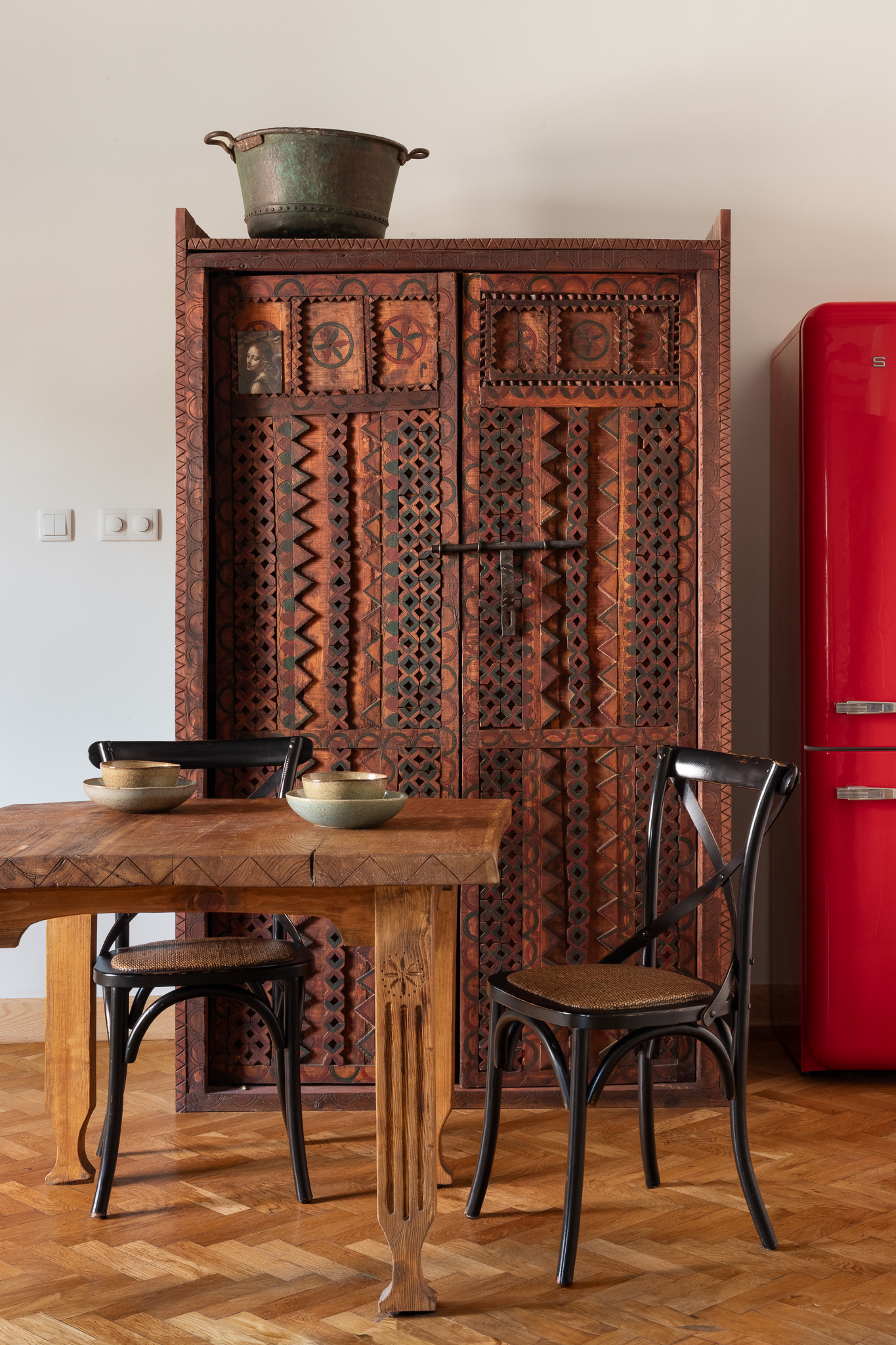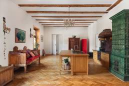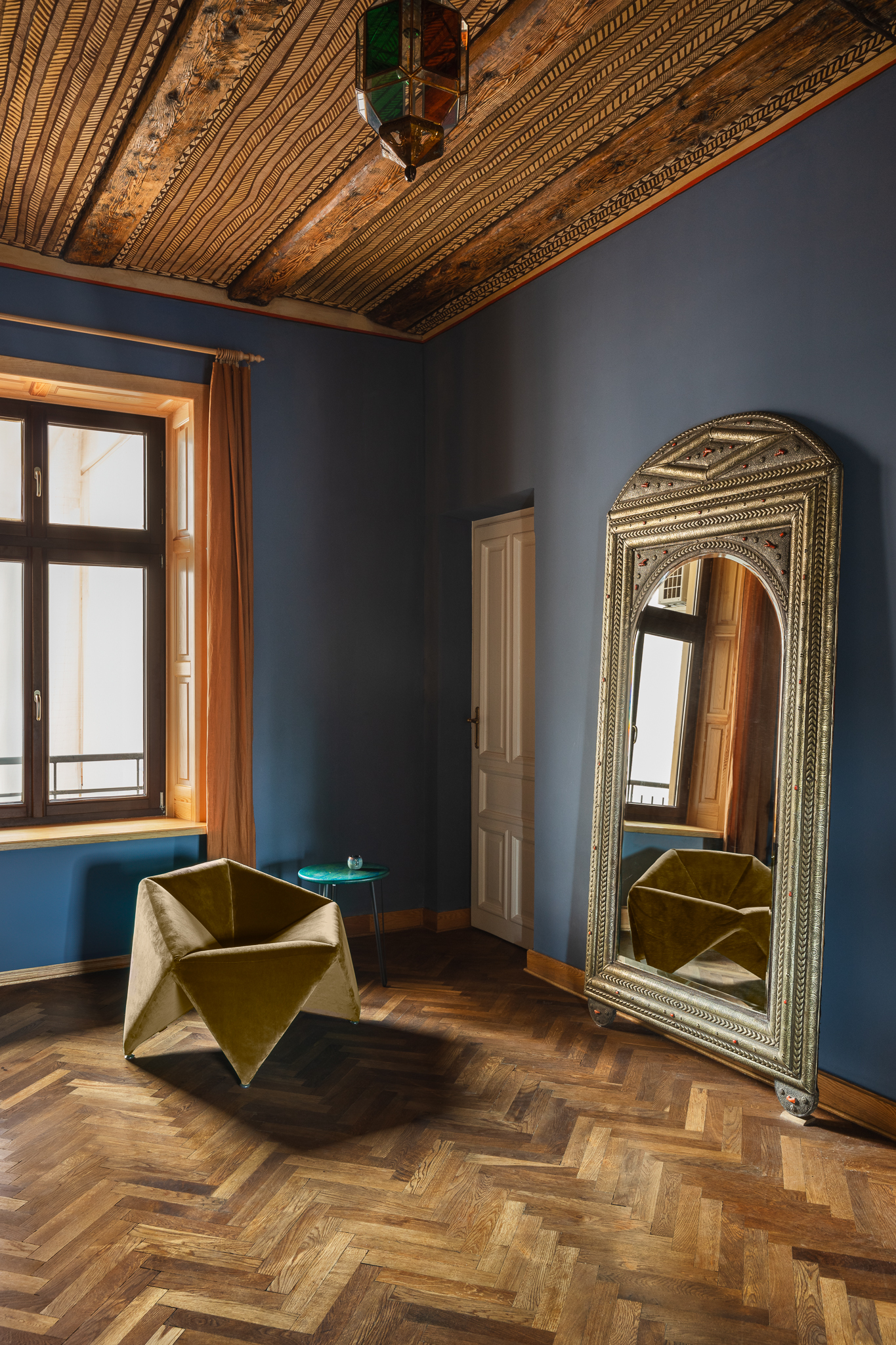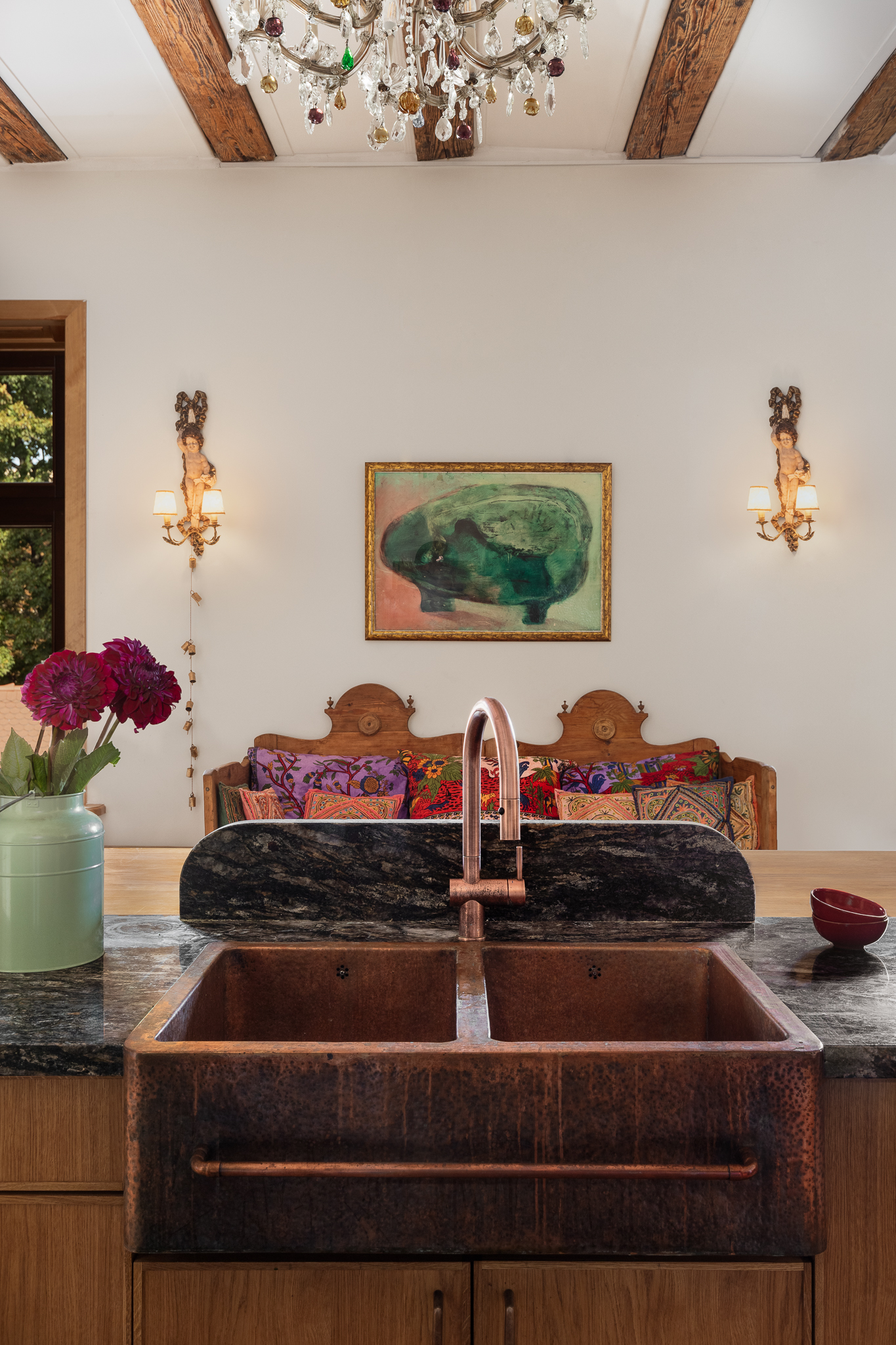 Przestrzeń emanowała naturalnym pięknem od samego początku — bardzo wysokie sufity, zabytkowa stolarka, stare parkiety i imponujące piece kaflowe. Jeden z nich, w kolorze malachitowym, został przeniesiony w sąsiedztwo kuchni, co wymagało cierpliwej pracy doświadczonego zduna. Inspiracją stała się fascynacja właściciela wschodnią kulturą — otwarty tryb życia, zamiłowanie do kolorów, rzemiosła i antyków z różnych zakątków świata dyktowały kierunek estetyczny.