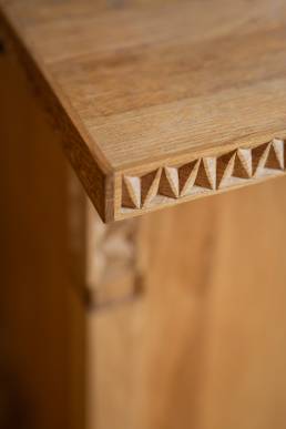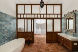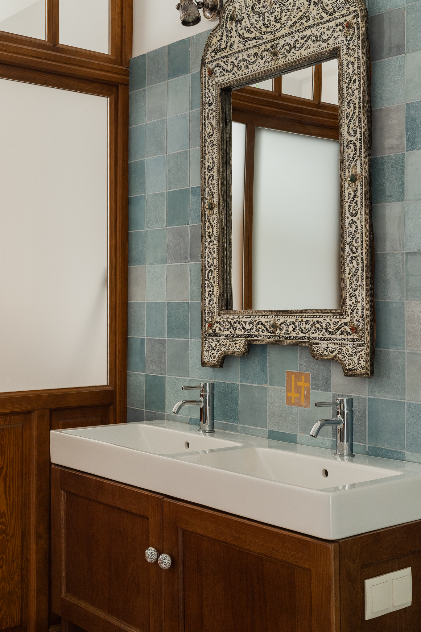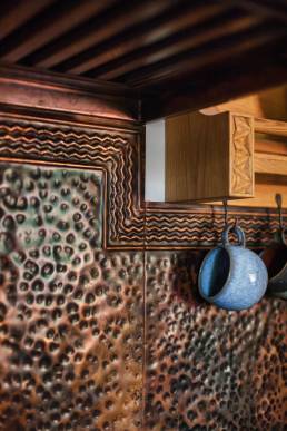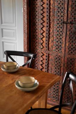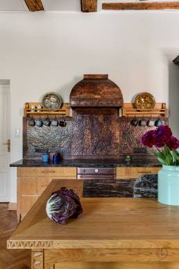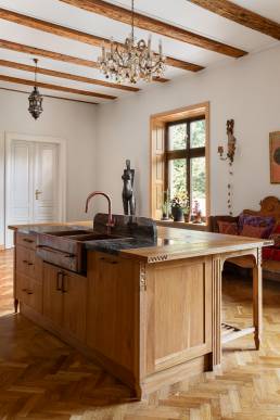Wiele mebli i luster sprowadzono z Maroka, a ich droga do nowego domu trwała kilka miesięcy. Sufity ozdobiono malowidłami inspirowanymi tradycyjnymi malunkami afrykańskiej wioski Tiébélé, zaprojektowanymi i wykonanymi przez Igora i Gaję Zamoyskich. Kuchnia to osobny rozdział — zlew, pokrycie ścian i okap wykonano na zamówienie z młotkowanej miedzi, a meble kuchenne rzeźbiono z litego dębu. Klamki odlano z mosiądzu na wzór oryginału.