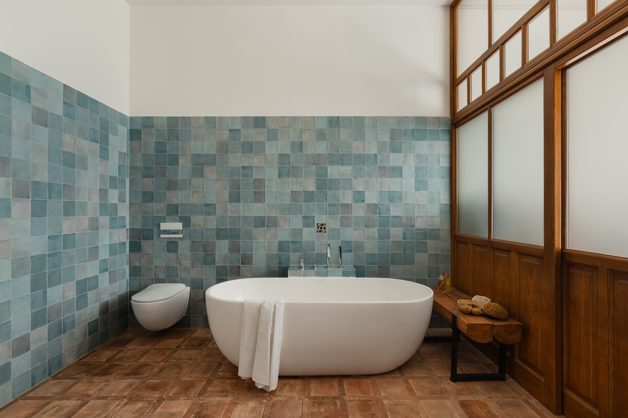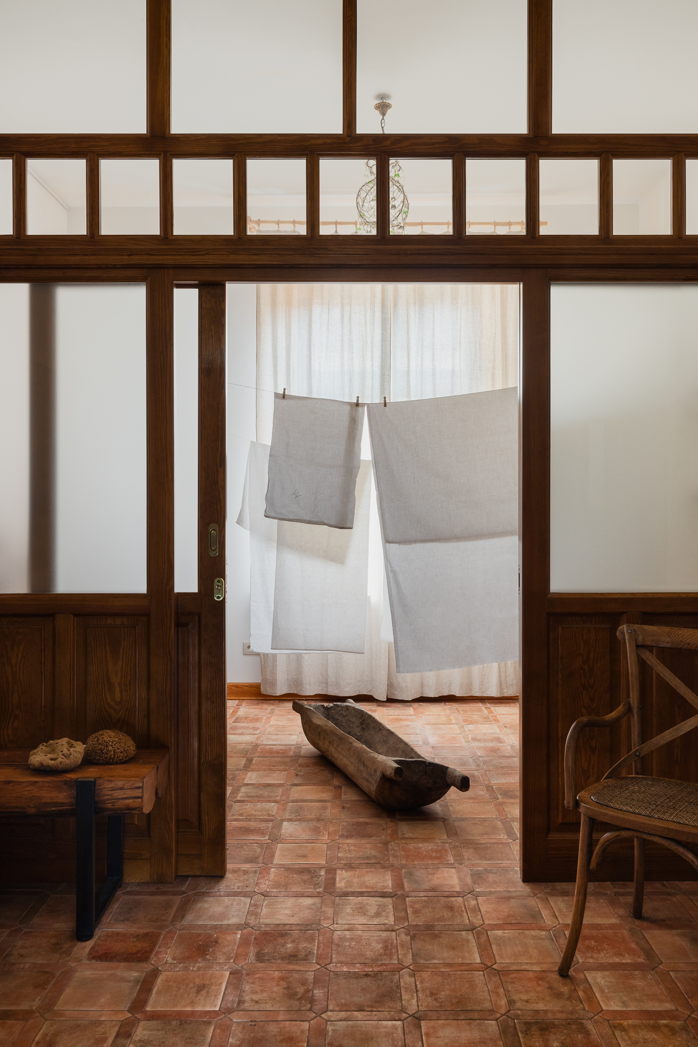 Właściciel jest profesjonalnym tancerzem, dlatego największy pokój przeznaczono na salę do ćwiczeń. Reszta amfiladowych pomieszczeń kształtowała się miesiącami — przesuwano meble, zmieniano lokalizację przedmiotów, próbowano kolorów na ścianach. Łazienka połączona z obszerną pralnią tworzy funkcjonalną przestrzeń przywołującą wrażenie prania powieszonego na świeżym powietrzu.
