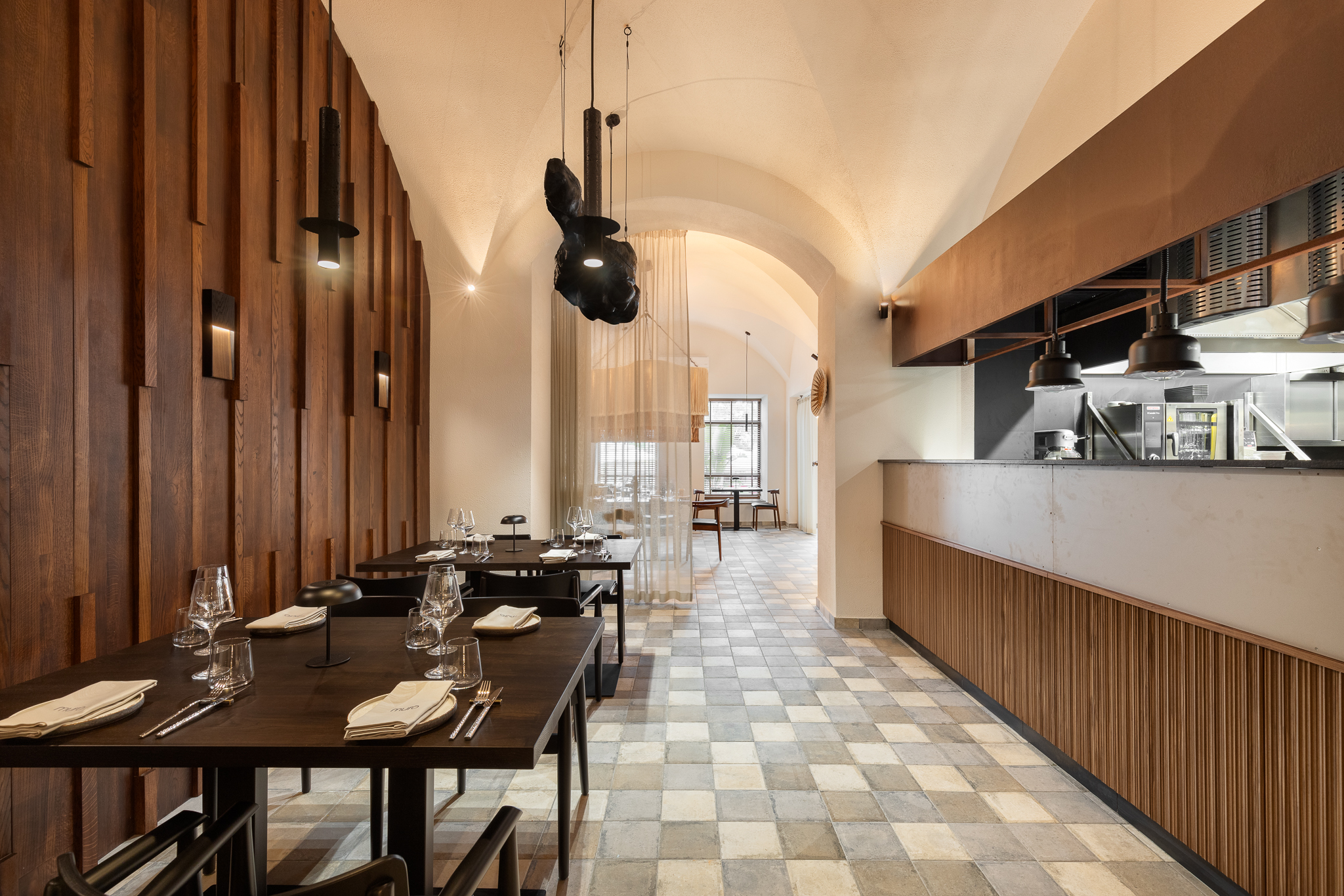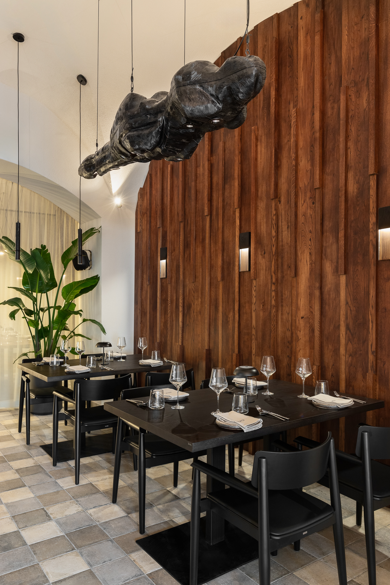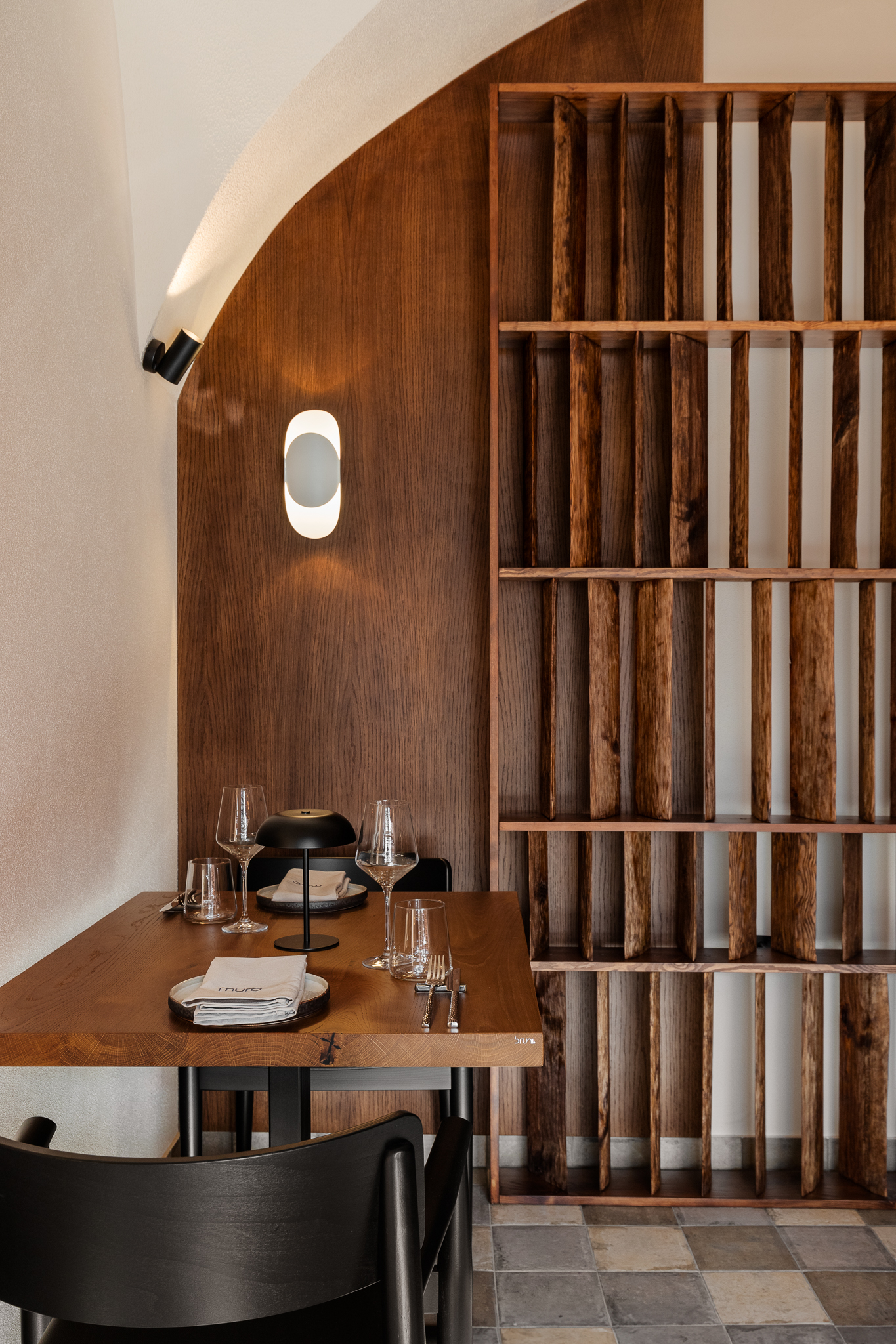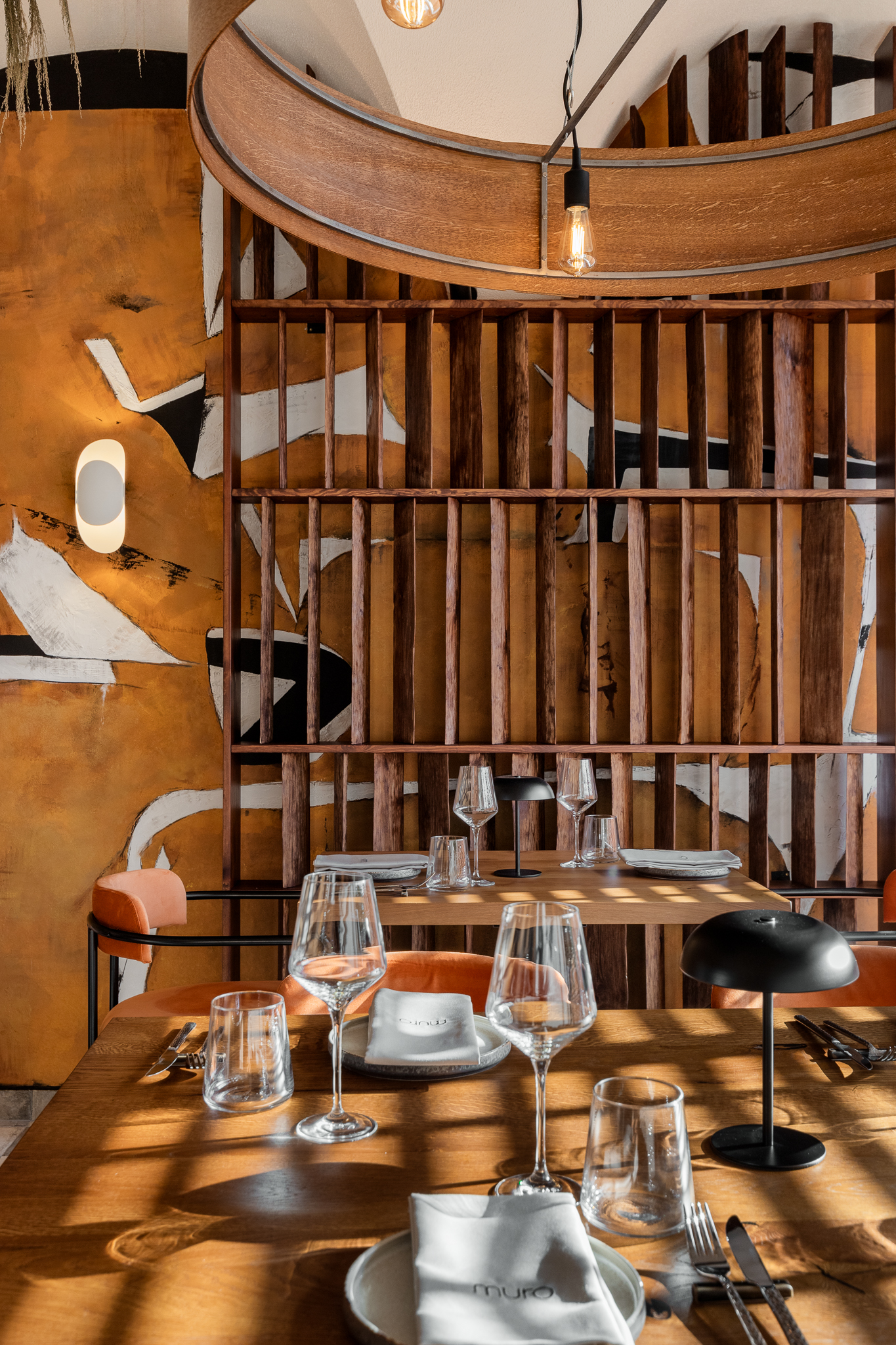 Dla Bello Studio był to pierwszy projekt w tak historycznej przestrzeni, ale ich podejście — łączenie autentyczności materiałów z niebanalną estetyką — sprawiło, że wnętrze Muro wpisało się w atmosferę tego miejsca.