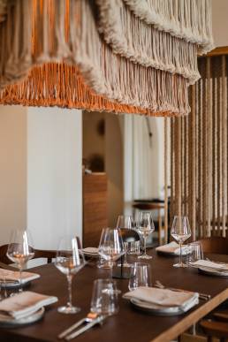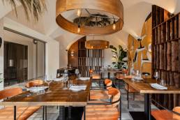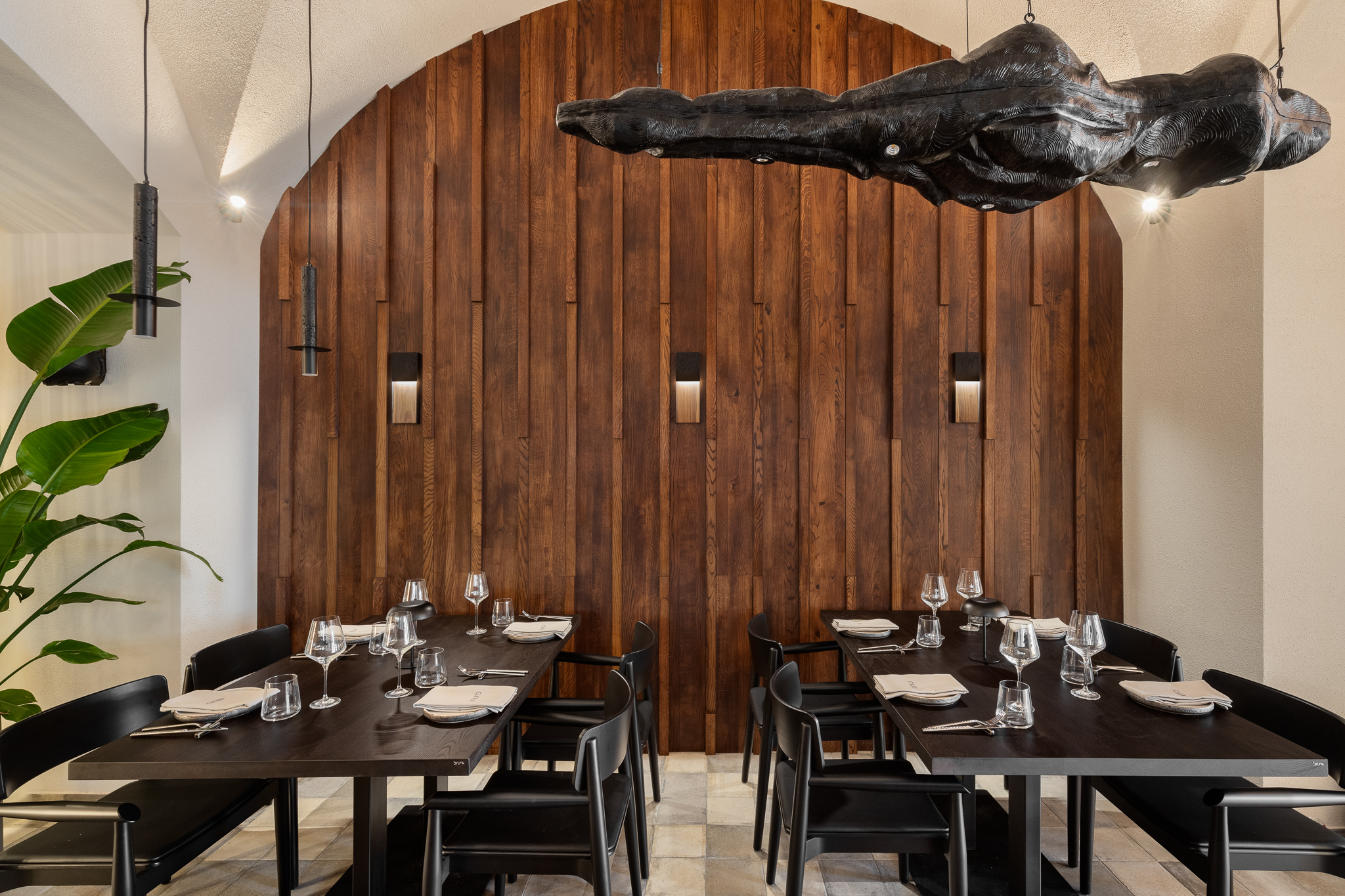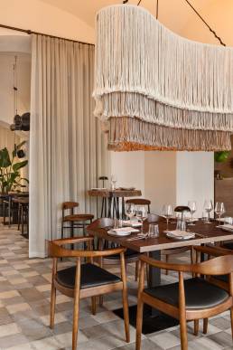 Restauracja Muro specjalizuje się w daniach z owoców morza i wołowiny, ale przyciąga gości nie tylko kuchnią. Pośrednią inspiracją dla projektu była kultura Peru, widoczna w detalach i akcentach — wiszących lnianych materiałach, grubych sznurach i kolorowych nitkach inspirowanych tradycyjnymi technikami tkania dywanów. Bujna naturalna roślinność wypełniająca restaurację wzmacnia wrażenie harmonii z naturą.