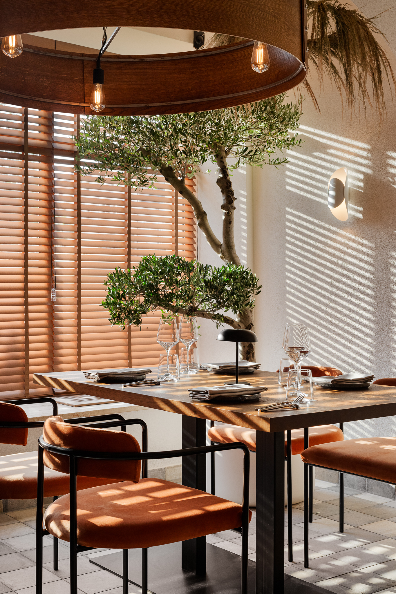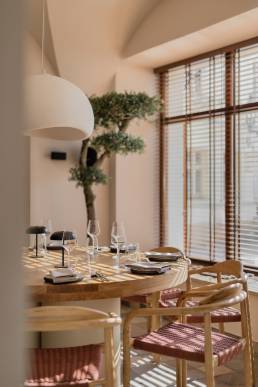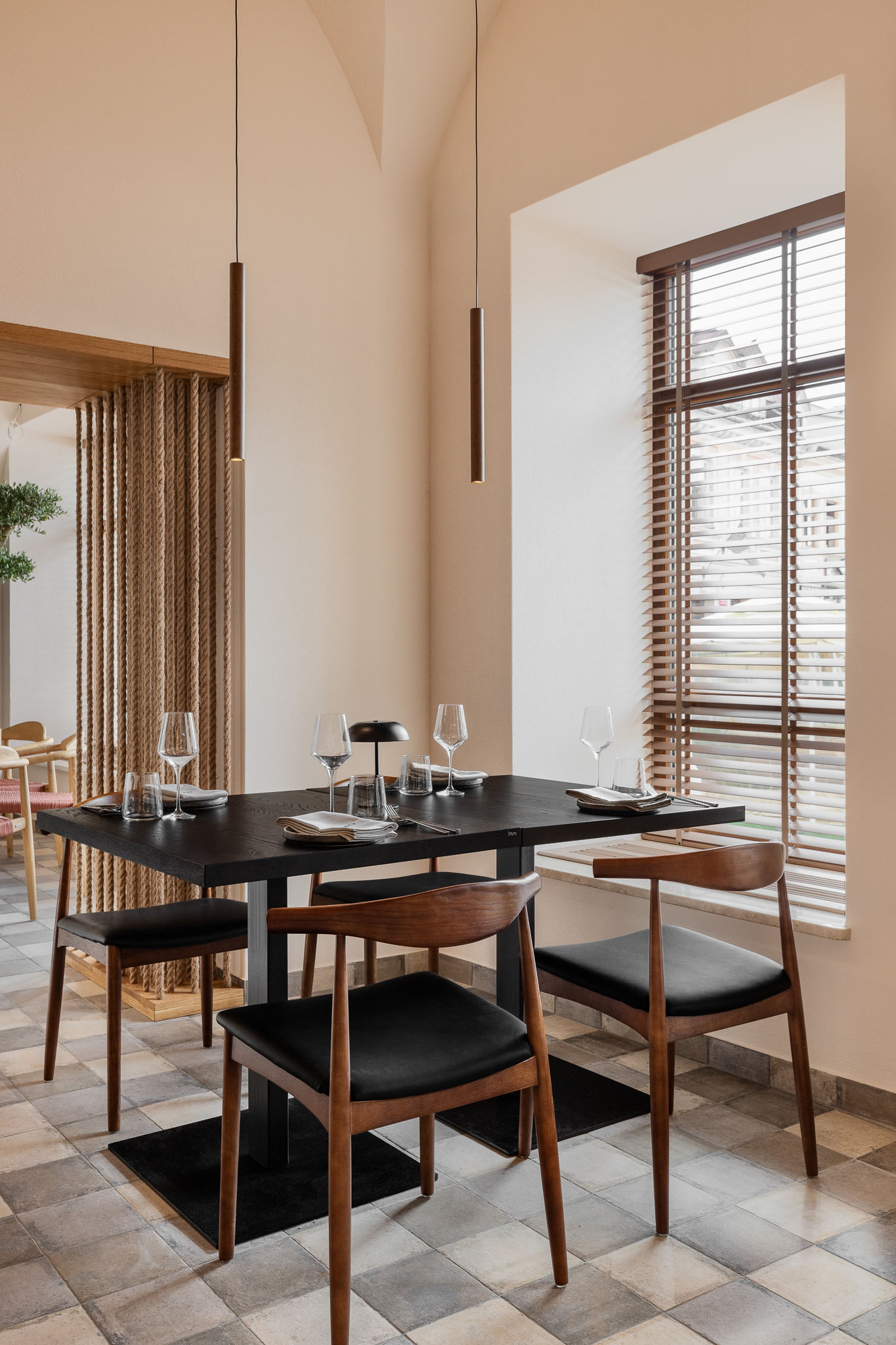W projekcie postawiono na organiczne materiały i kolory, które podkreślają bliskość natury i wprowadzają ciepło do przestrzeni. Większość mebli wykonano na zamówienie przez lokalnych rzemieślników z Rzeszowa — każdy stół, krzesło i lampa zostały zaprojektowane z dbałością o detal. Różne modele mebli, mimo odmiennej stylistyki, płynnie się ze sobą łączą i nadają wnętrzu indywidualny charakter.