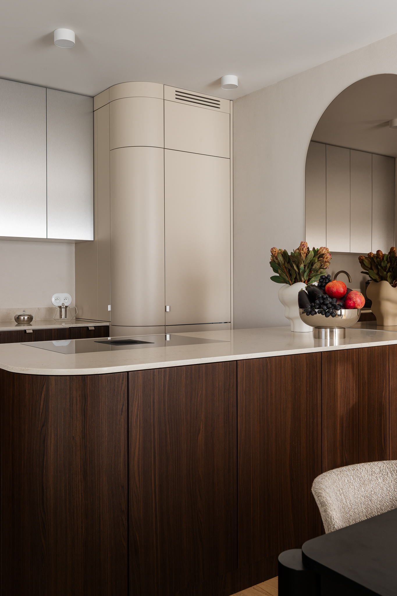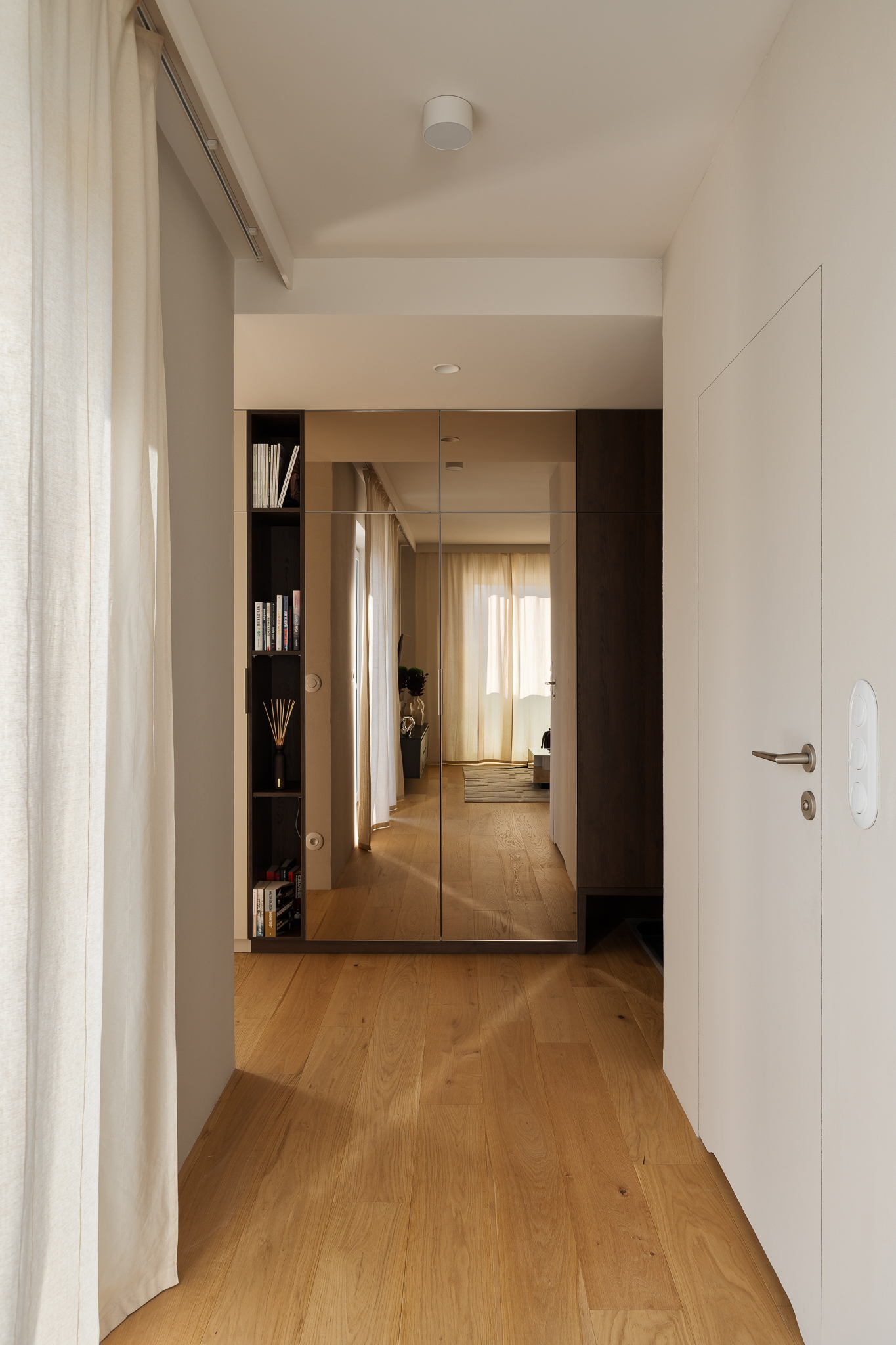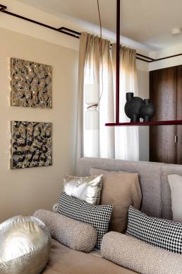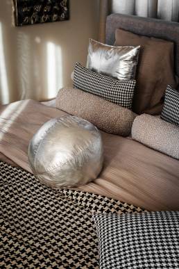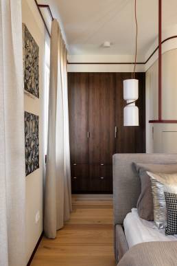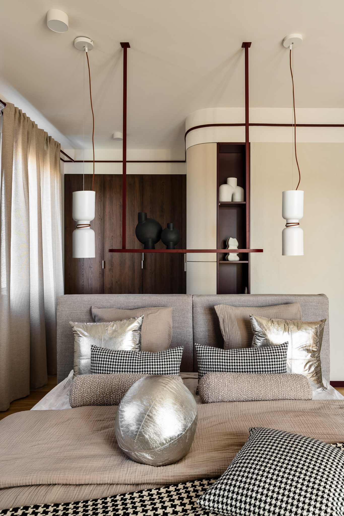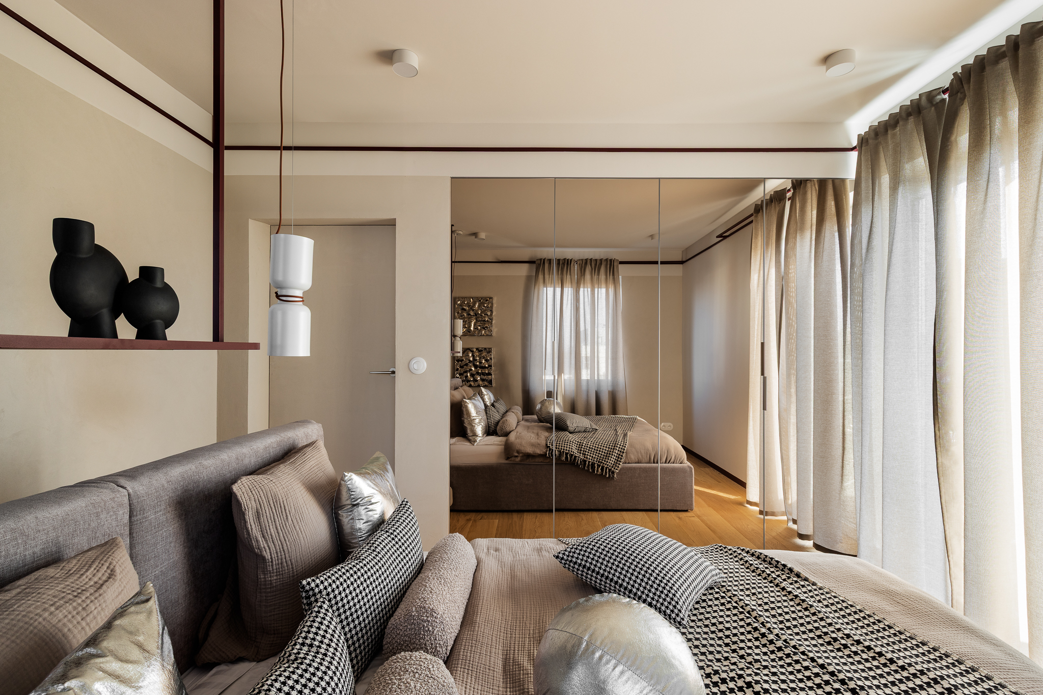 Delikatne lniane zasłony, bawełniane tekstylia i ciepłe wykończenia z drewna wprowadzają naturalny spokój. Ich szlachetna prostota daje poczucie autentyczności i bliskości z naturą. Sypialnia zaprojektowana jako oaza spokoju — tapicerowane łóżko wykonane na zamówienie, paleta ziemistych beżów z akcentami w głębokim bordo i lustrzane drzwi szafy, które optycznie powiększają przestrzeń i pogłębiają wrażenie przestronności.