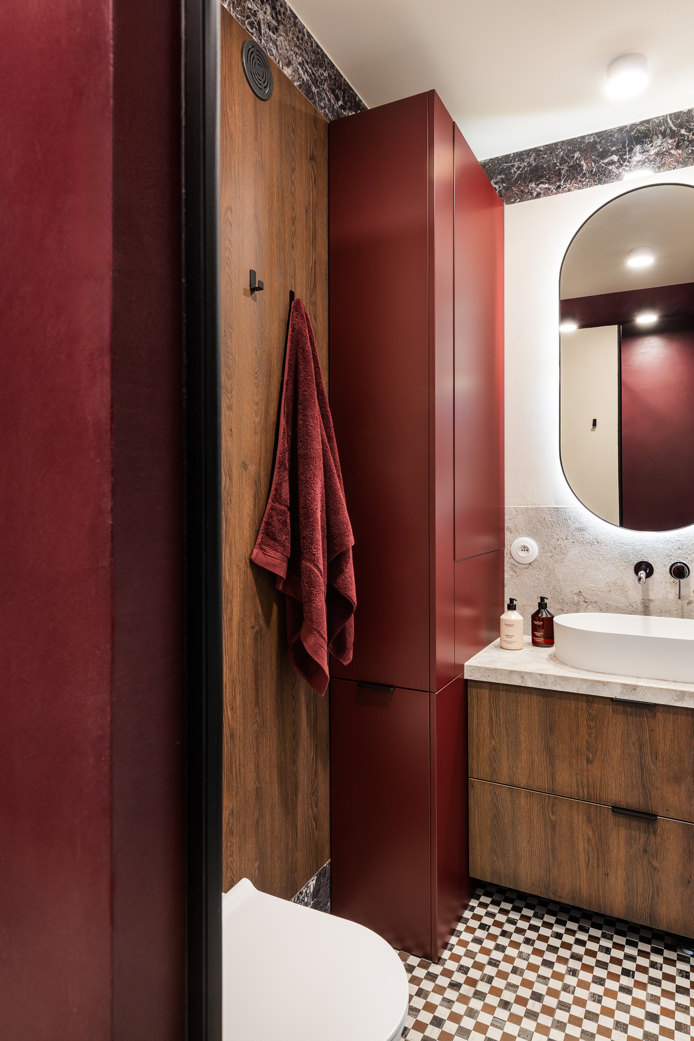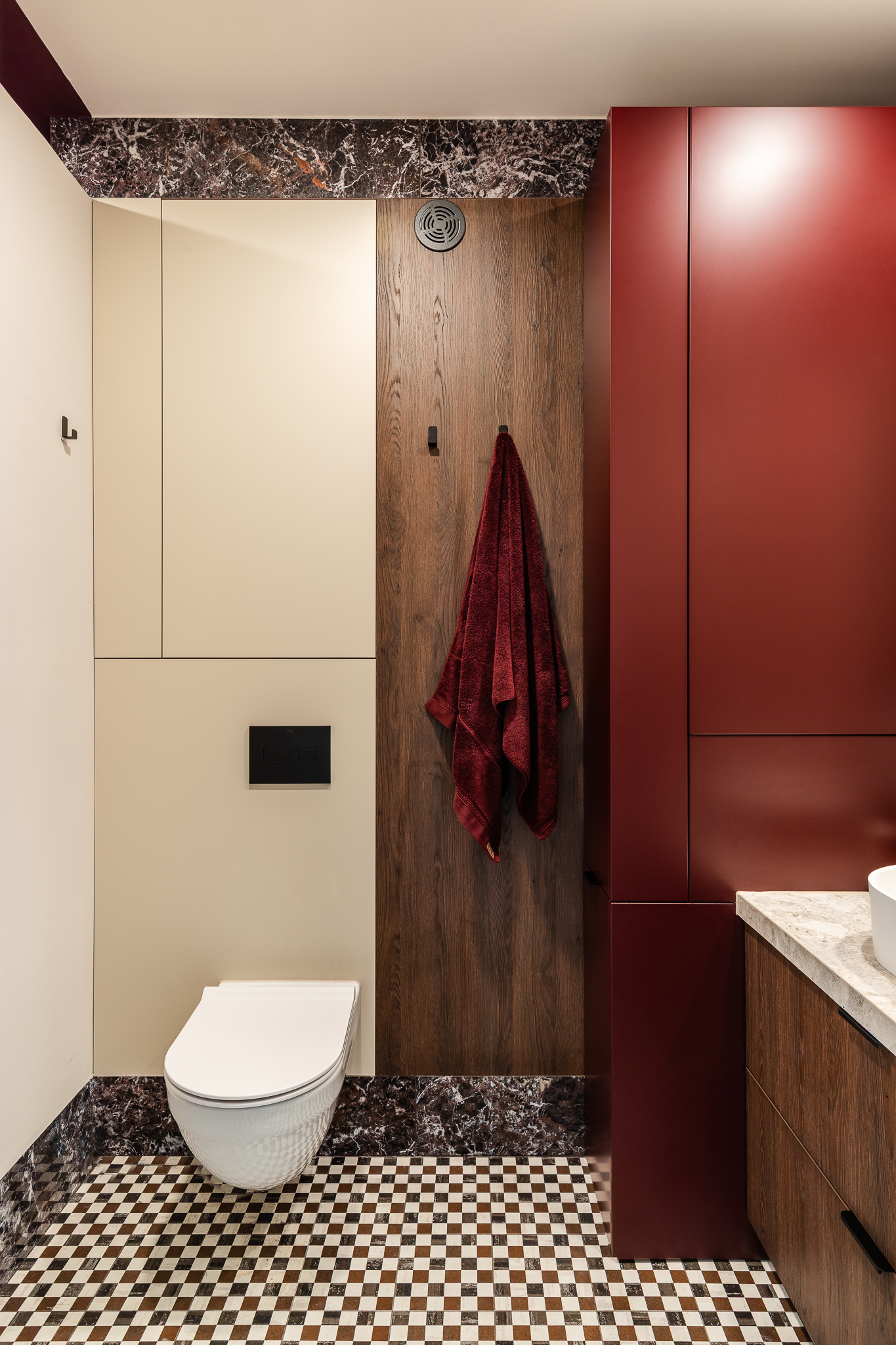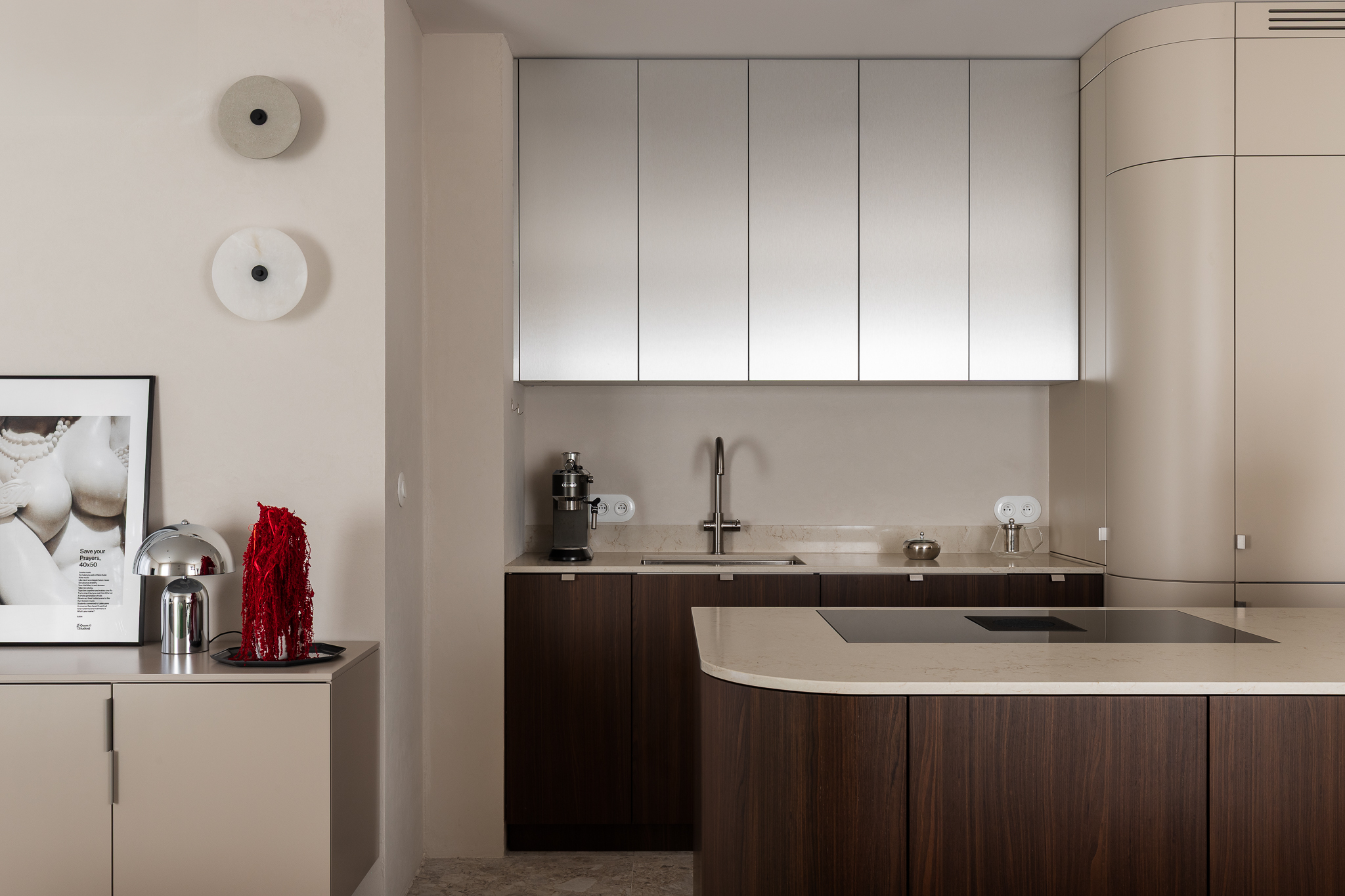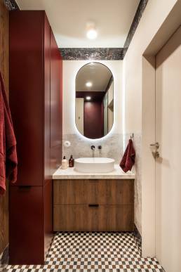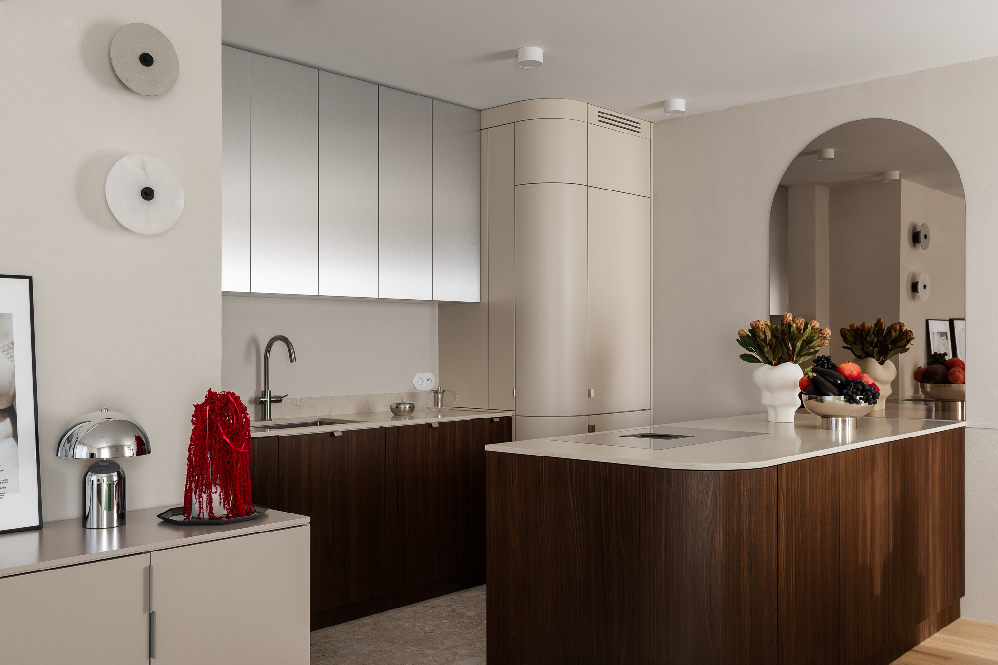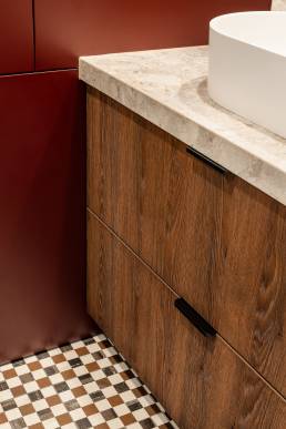 Delikatne lniane zasłony, bawełniane tekstylia i ciepłe wykończenia z drewna wprowadzają naturalny spokój. Ich szlachetna prostota daje poczucie autentyczności i bliskości z naturą. Sypialnia zaprojektowana jako oaza spokoju — tapicerowane łóżko wykonane na zamówienie, paleta ziemistych beżów z akcentami w głębokim bordo i lustrzane drzwi szafy, które optycznie powiększają przestrzeń i pogłębiają wrażenie przestronności.