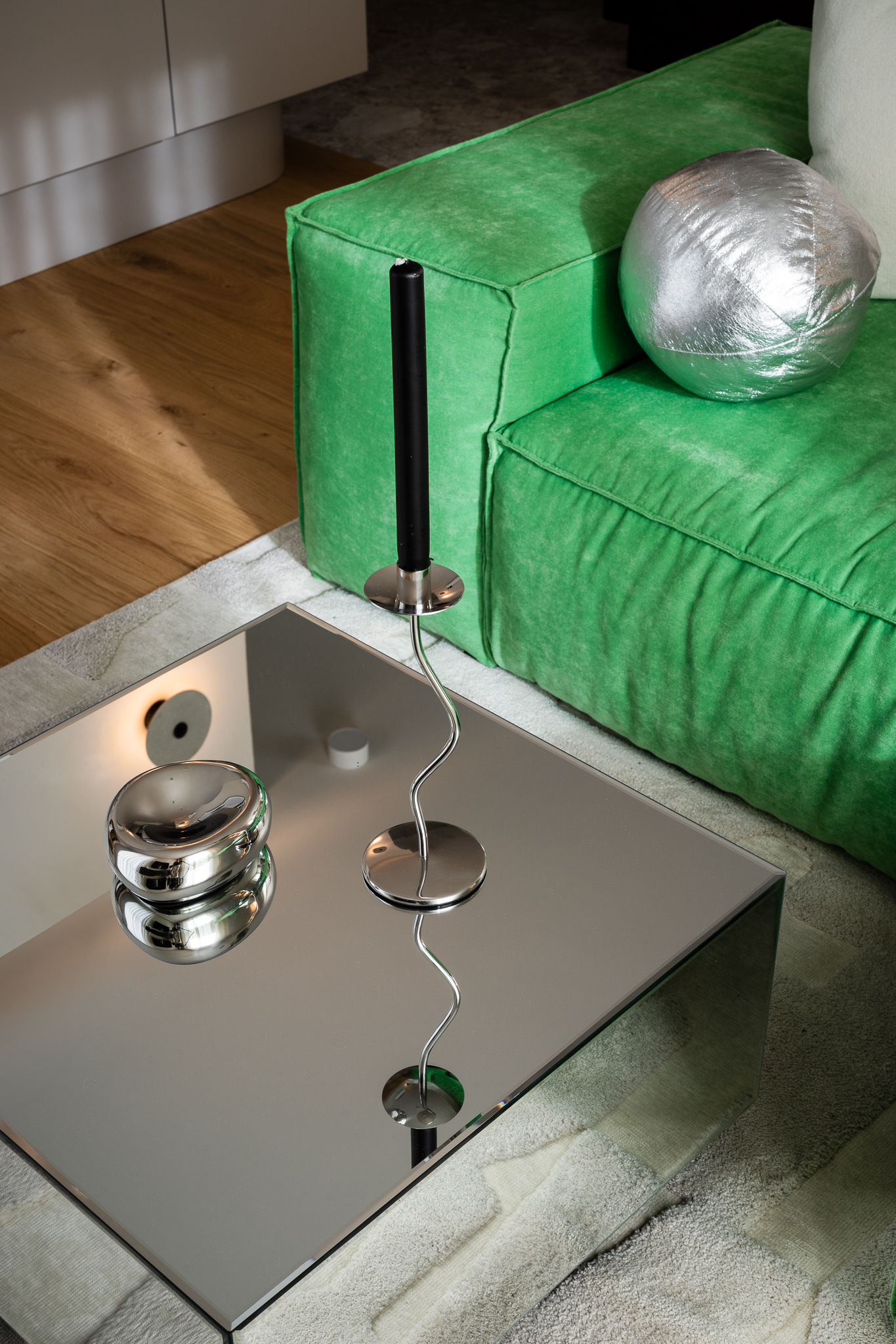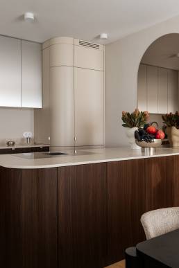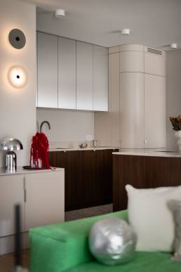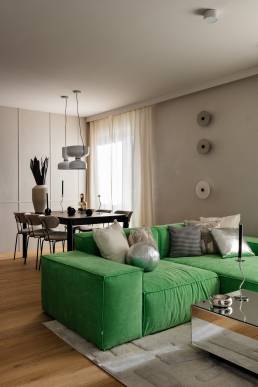 Główne założenie projektu to balans między nowoczesnym designem a przytulnością. Jednym z większych wyzwań było dobranie koloru sofy — inwestorzy przyszli do pracowni z butami Nike w trawiastym kolorze i poprosili, żeby sofa była dokładnie w tym odcieniu. I tak właśnie powstał jeden z najbardziej charakterystycznych elementów całego wnętrza. Liczne zaokrąglenia w bryle mebli i detalach nadają przestrzeni lekkości i miękkiego rytmu.